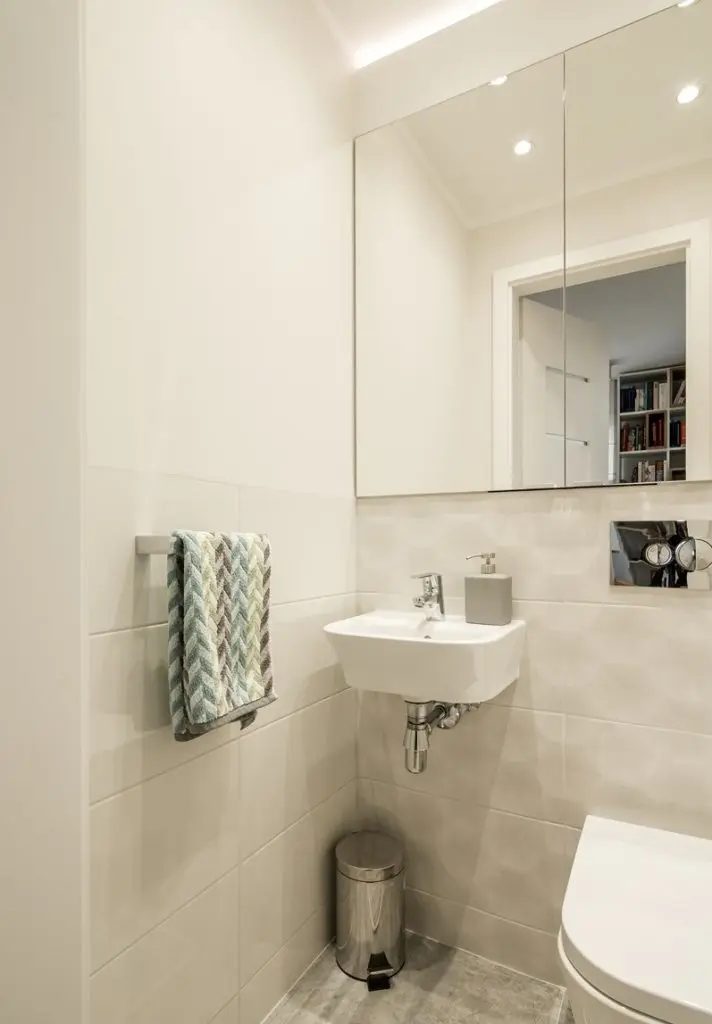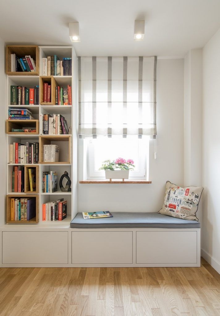 Pentru a crea o largire a spatiului, a fost eliminata usa de la living, iar o parte a holului a fost amenajat ca o continuare a camerei printr-un loc de lectura cu biblioteca si spatiu de sezut. Excelenta abordare! Tot aici vom gasi si o parte din spatiile de depozitare sub forma unor dulapuri amenajate in dreptul dormitoarelor.