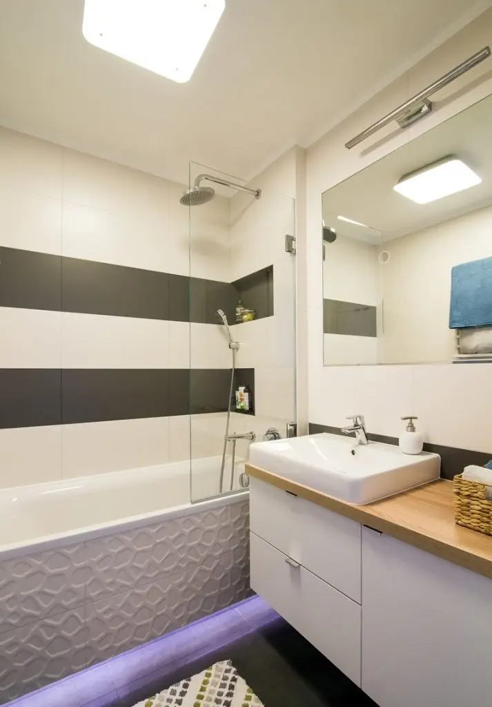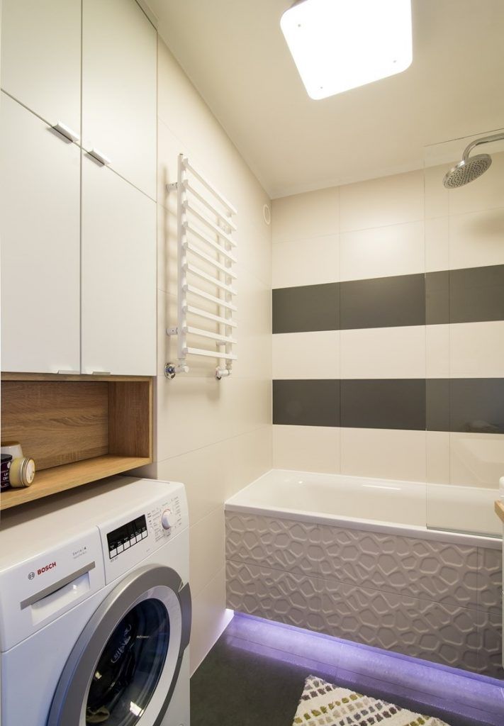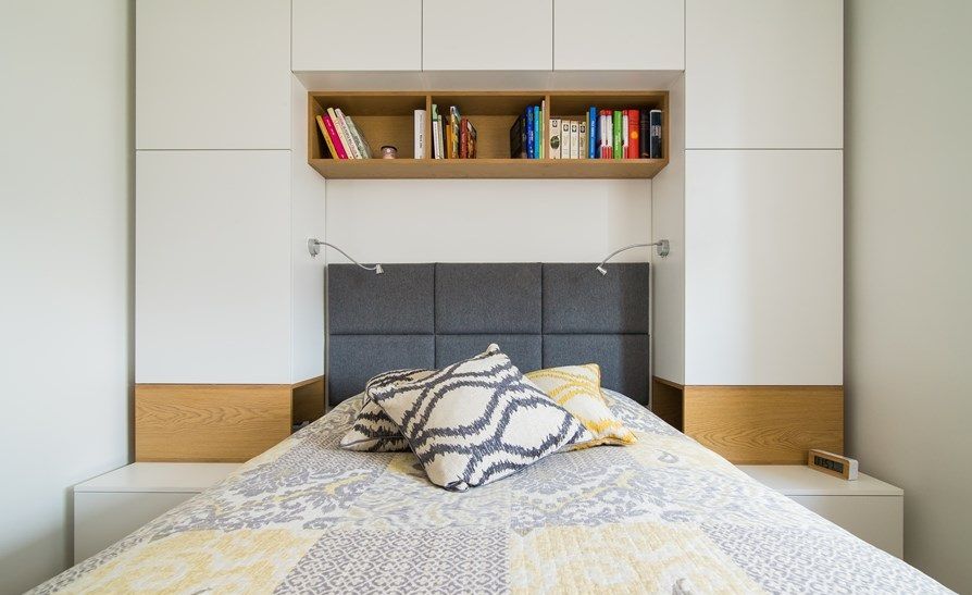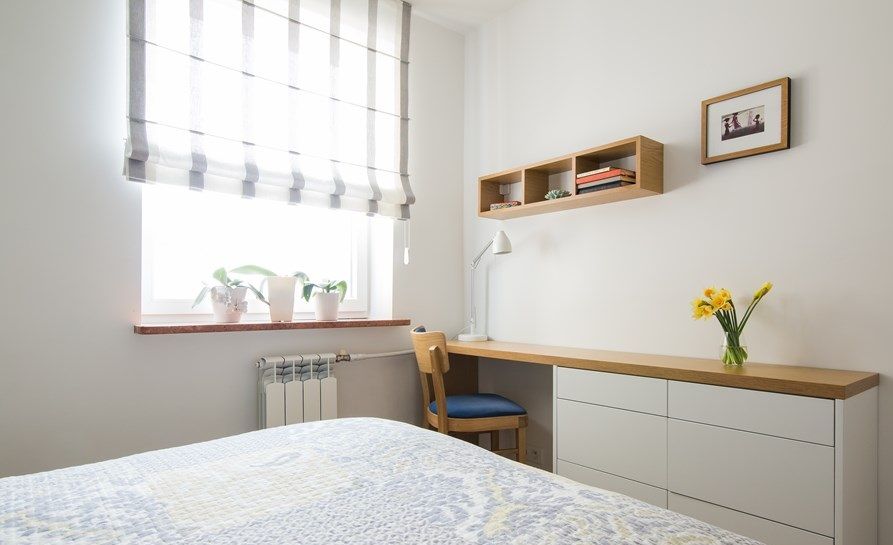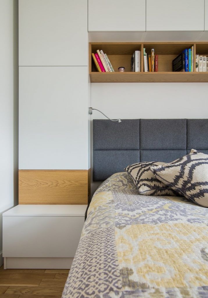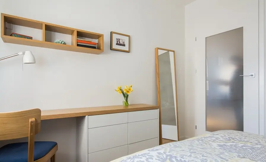 Dormitorul matrimonial preia paleta de culori din living. In ciuda spatiului de doar 9 metri patrati, designerii au reusit sa integreze zone de depozitare dispuse simetric de o parte si cealalta a patului, dar si o comoda si un mic spatiu de lucru sau masuta de machiaj, dupa caz. Albul si lemnul fac casa buna impreuna in aceasta amenajare.