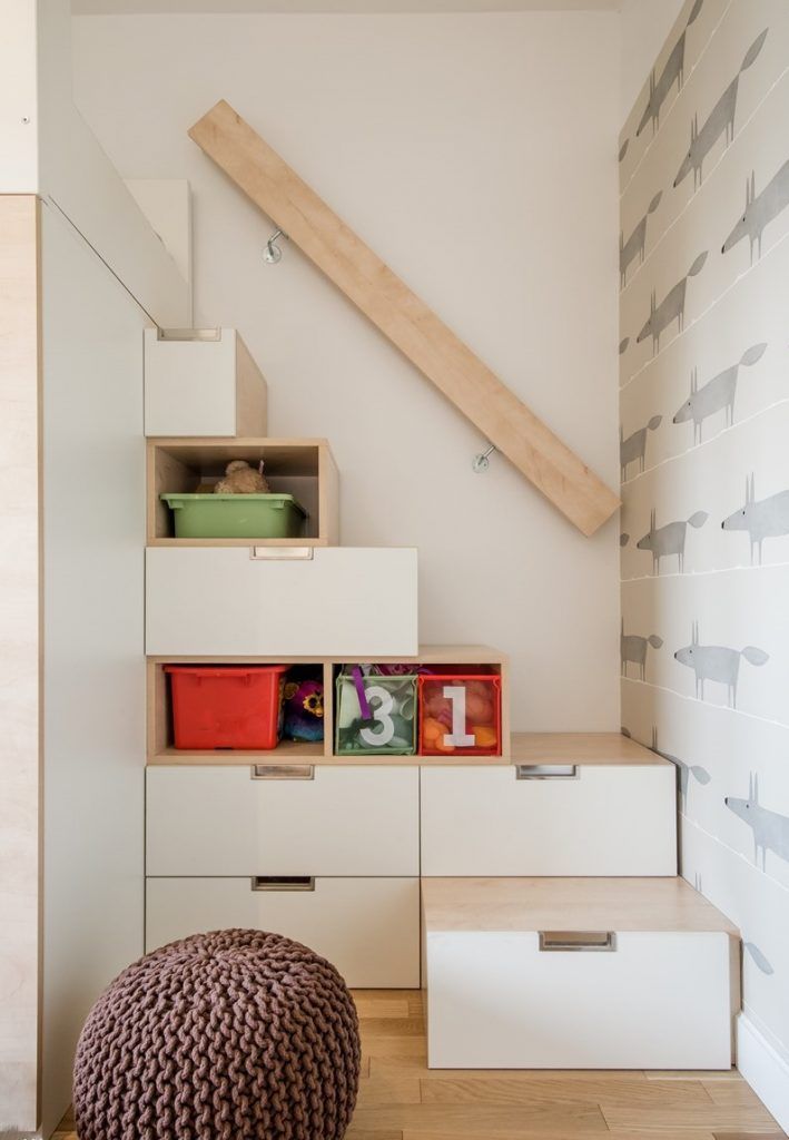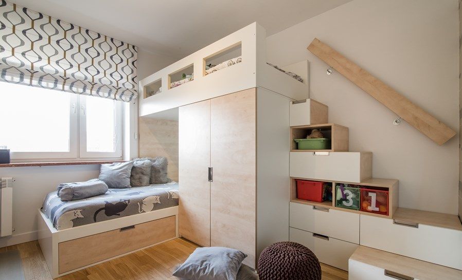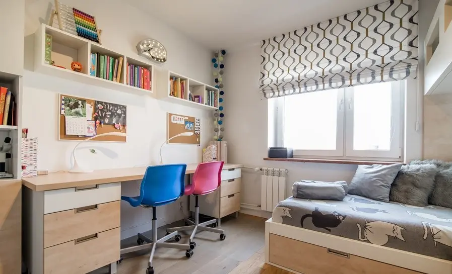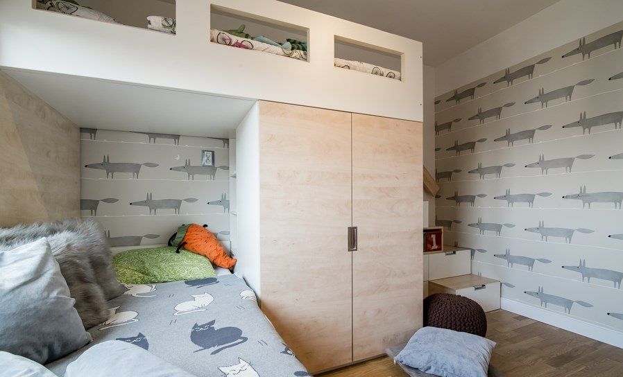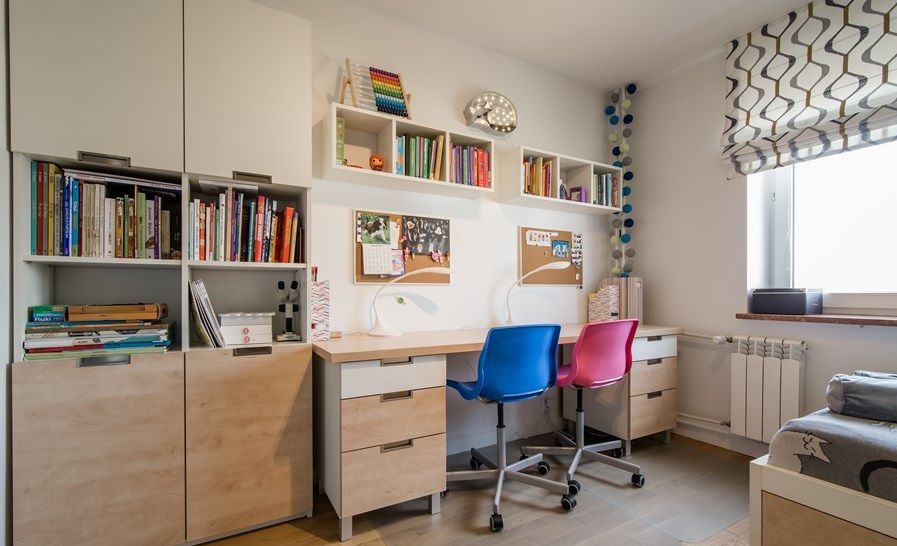 Camera copiilor a primit si ea o optimizare pe masura. Mobilierul a fost realizat pe comanda dupa schitele designerilor, integrand doua paturi, dulap pentru haine si diverse sertare. De cealalta parte a camerei, a fost amenajata zona de studiu, cu un birou lung si dulapuri pentru carti, caiete si alte materiale necesare copiilor la scoala.