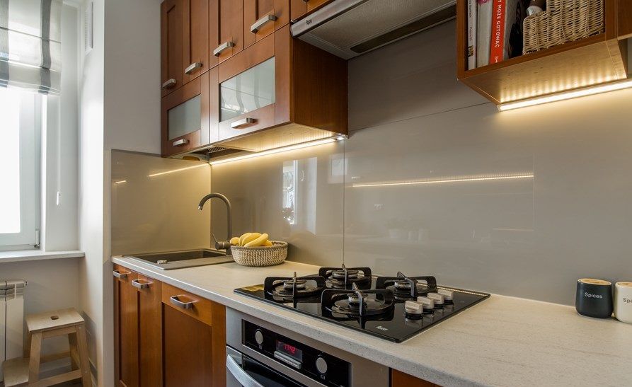 Bucataria de aproape 6 metri patrati a fost optimizata printr-o dispunere paralela a dulapurilor, folosind spatiul pe verticala. Electrocasnicele au fost incorporate in mobilier pentru a pastra decorul cat mai ordonat si unitar. Braul dintre corpurile superioare si cele inferioare este placat cu panou din sticla pentru a reflecta lumina si a amplifica pe cat posibil spatiul. In acelasi scop, au fost adaugate benzi L ED sub dulapuri.