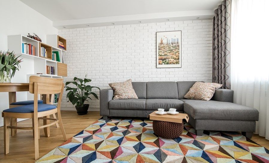 In living, predomina un joc geometric discret pe care il regasim atat la nivelul pieselor de mobilier, cat si la nivelul covorului sau al draperiilor. Caramida aparenta aduce un plus de textura, iar accentele de culoare dau o nota vesela spatiului. Suprafata de aproape 20 de metri patrati a permis si amenajarea unui loc de luat masa.