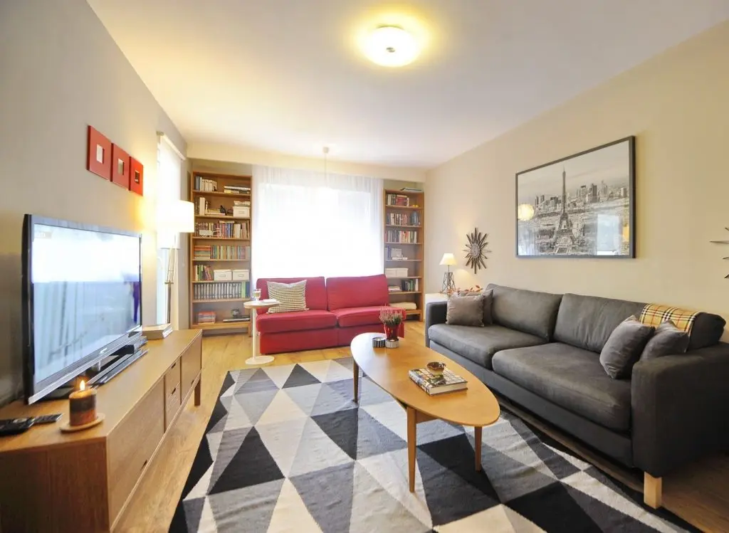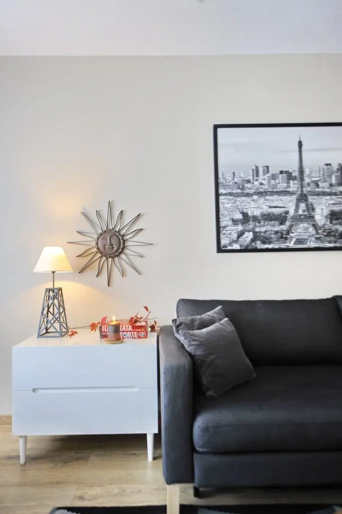 Mobilierul din living ne aminteste de stilul retro. Inaltarea prin picioruse a pieselor de mobilier creeaza creeaza impresia de mai mult spatiu la nivelul pardoselii. Spatiul pare astfel mai fluent si mai aerisit. Excelent truc de aplicat in camerele mici! Jocul geometric al covorului din living aduce un plus de dinamica incaperii, respectand tematica griurilor.