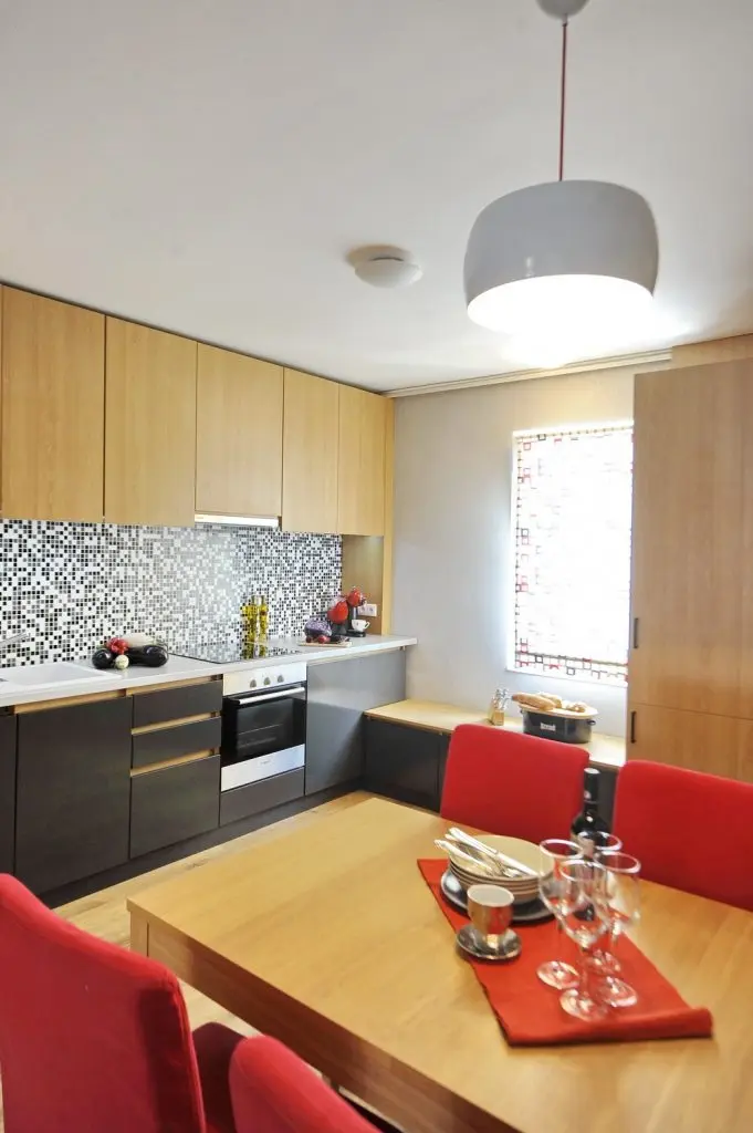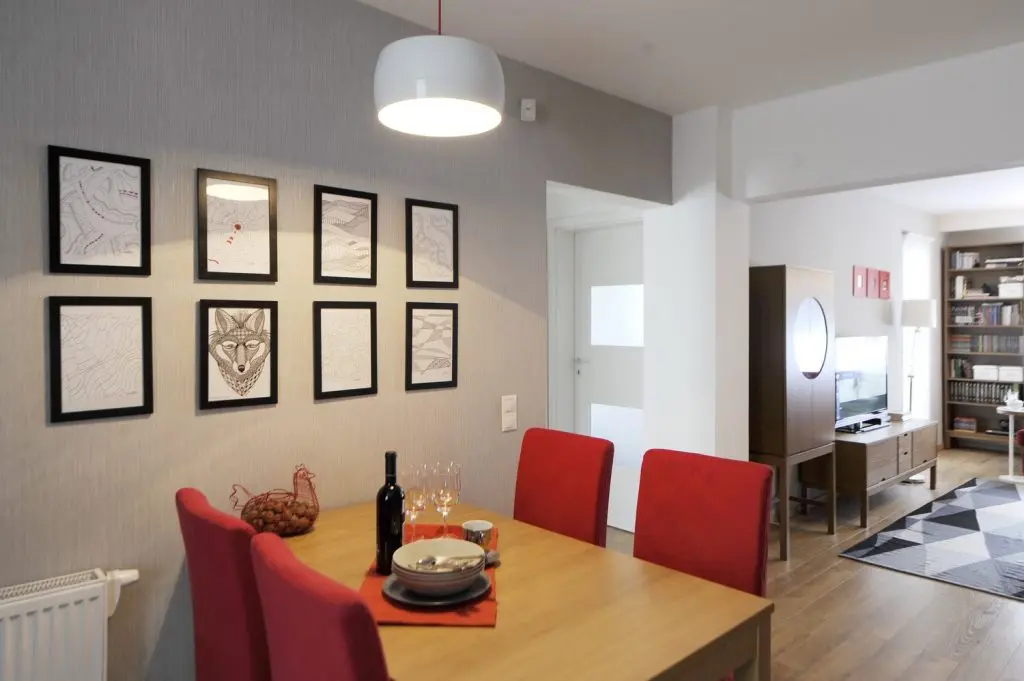 Una din dorintele pe care le-au avut cei doi a fost integrarea griului si rosului in amenajare, astfel ca tot decorul s-a construit in jurul acestei combinatii. O regasim in bucatarie – vezi scaunele cu tapiterie rosie si dulapurile principale cu finisaj gri; in living la nivelul celor 2 canapele sau in baie. Accentele cromatice sunt temperate de nuante neutre si de esentele naturale ale lemnului. Spatiul este astfel echilibrat, iar rosul este bine pus in valoare.