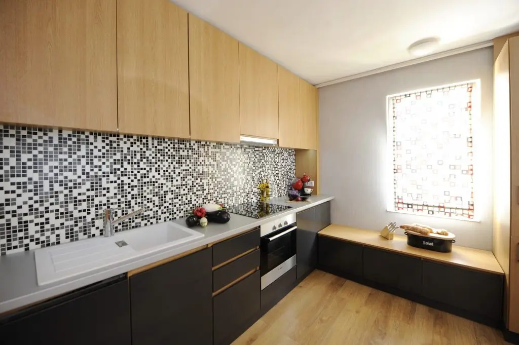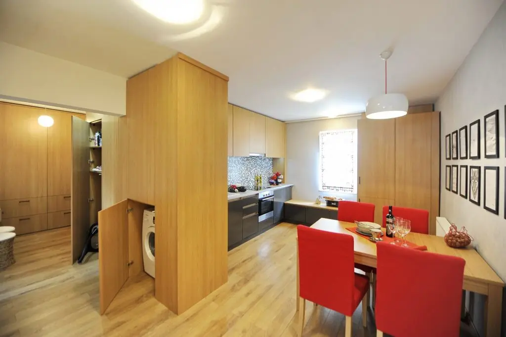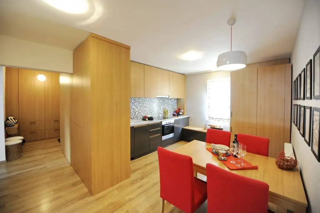 Deschide GaleriaTinerii beneficiari si-au dorit o casa functionala, amenajata modern, cu bucatarie spatioasa si cu locuri suficiente pentru depozitare. Suprafata de 60 metri patrati si vechimea apartamentului au fost o provocare pentru Simona. Renovarea a fost complexa si a presupus inlocuirea tuturor instalatiilor, tamplariei, usilor, pardoselii. A fost eliminata camara dintre hol si bucatarie, iar spatiul rezultat a fost amenajat ca o zona tehnica si de depozitare: acolo au fost incorporate masina de spalat rufe si aspiratorul.