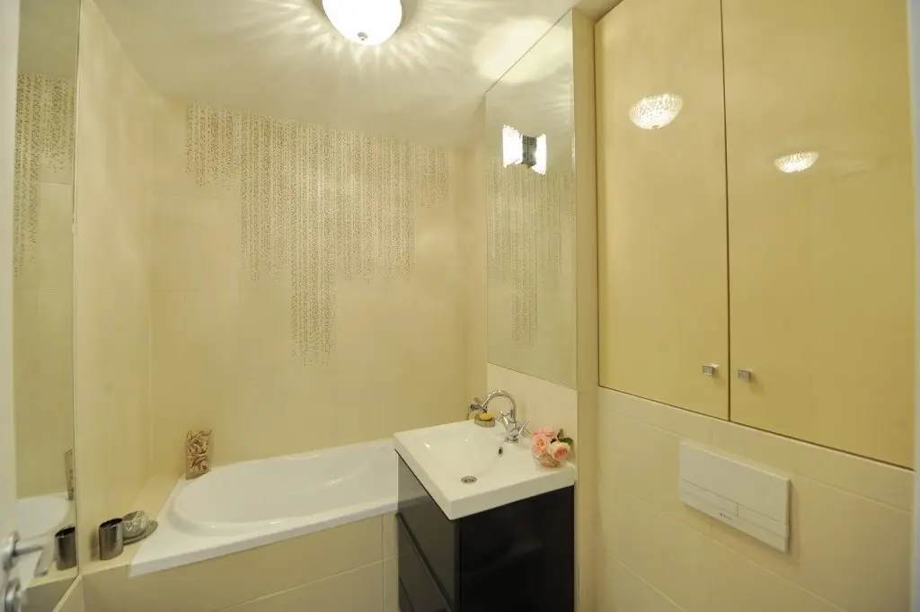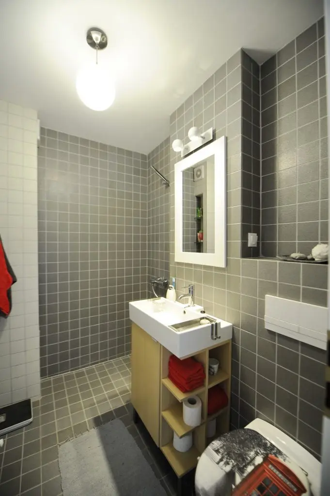 Apartamentul este prevazut cu doua bai, astfel ca cei doi au parte de spatiul propriu. Baia lui este conturata in linii masculine, griul fiind predominant. Baia ei este mai blanda in abordare, mai luminoasa prin finisaje deschise, intr-un cuvant, mai feminina.
