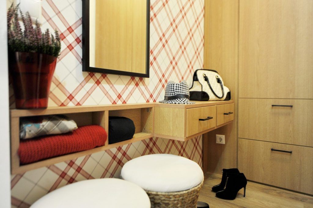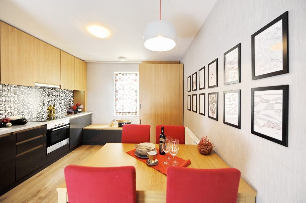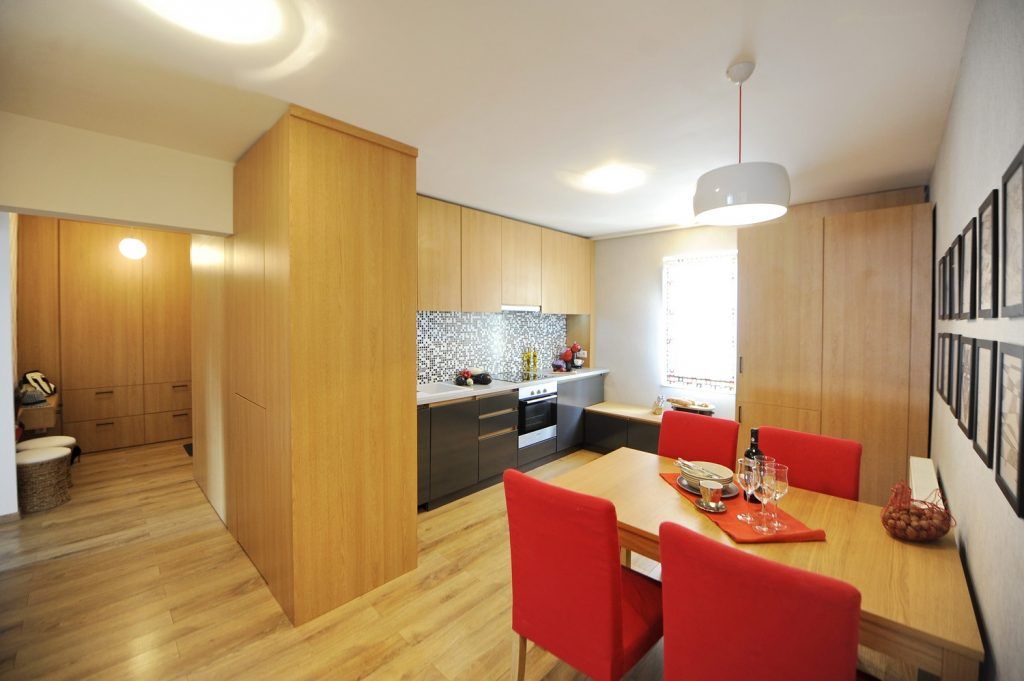 Una din dorintele pe care le-au avut cei doi a fost integrarea griului si rosului in amenajare, astfel ca tot decorul s-a construit in jurul acestei combinatii. O regasim in bucatarie – vezi scaunele cu tapiterie rosie si dulapurile principale cu finisaj gri; in living la nivelul celor 2 canapele sau in baie. Accentele cromatice sunt temperate de nuante neutre si de esentele naturale ale lemnului. Spatiul este astfel echilibrat, iar rosul este bine pus in valoare.