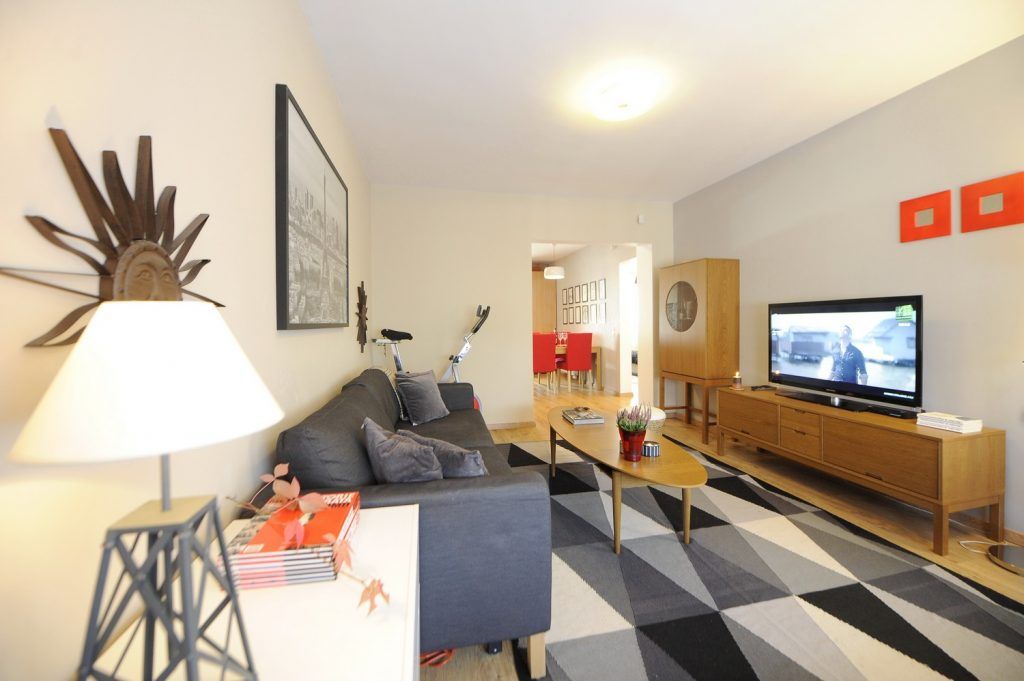 Mobilierul din living ne aminteste de stilul retro. Inaltarea prin picioruse a pieselor de mobilier creeaza creeaza impresia de mai mult spatiu la nivelul pardoselii. Spatiul pare astfel mai fluent si mai aerisit. Excelent truc de aplicat in camerele mici! Jocul geometric al covorului din living aduce un plus de dinamica incaperii, respectand tematica griurilor.