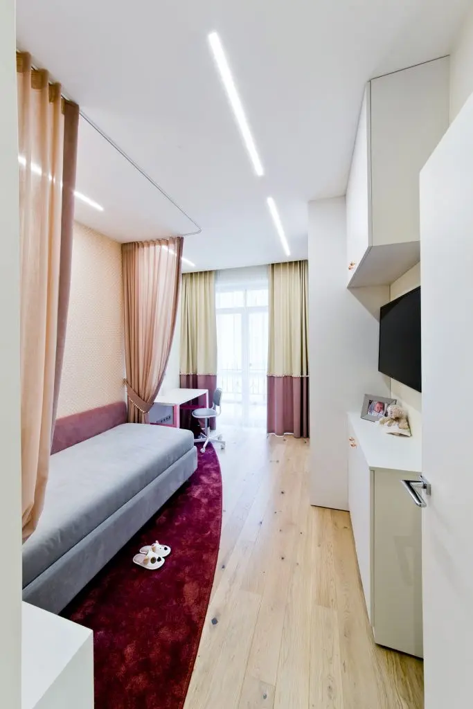 Camerele copiilor sunt vesel colorate, in accente de visiniu, frez petru fetita si accente de culoare blue pentru baietel. Din nou regasim perete accent cu tapet pentru o nota personala precum si dulapuri dedicate depozitarii.