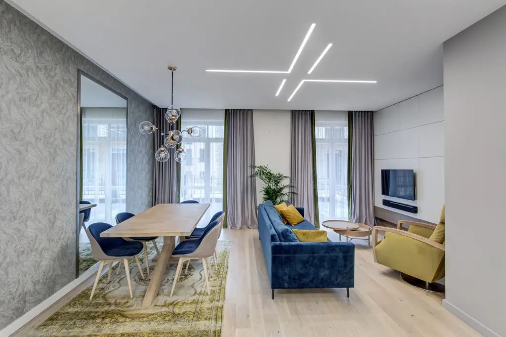 Living-ul multifunctional, in plan deschis cu bucataria si zona de luat masa, formeaza un spatiu unic, prelungit si ideal pentru o familie extinsa. Ne bucuram de o camera aerisita cu o cromatica echilibrata unde accentele de albastru sunt stinse cu nuante calde de crem, bej si alb. Draperiile impreuna cu planta decorativa ne transpun o noua tema abordata, si anume natura.