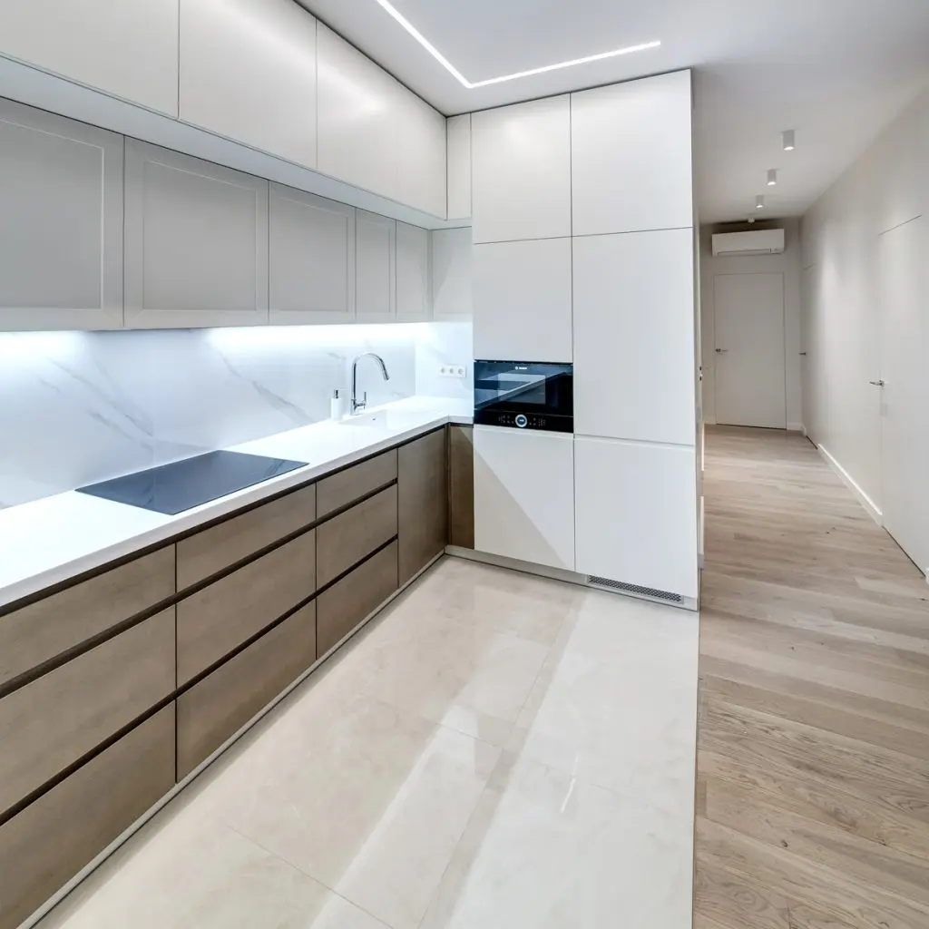 Bucataria pastreaza simplitatea prin alegerea unui mobilier minimalist alb in contrast cu maro. Electrocasnicele sunt incorporate pentru un plus de unitate si ordine.