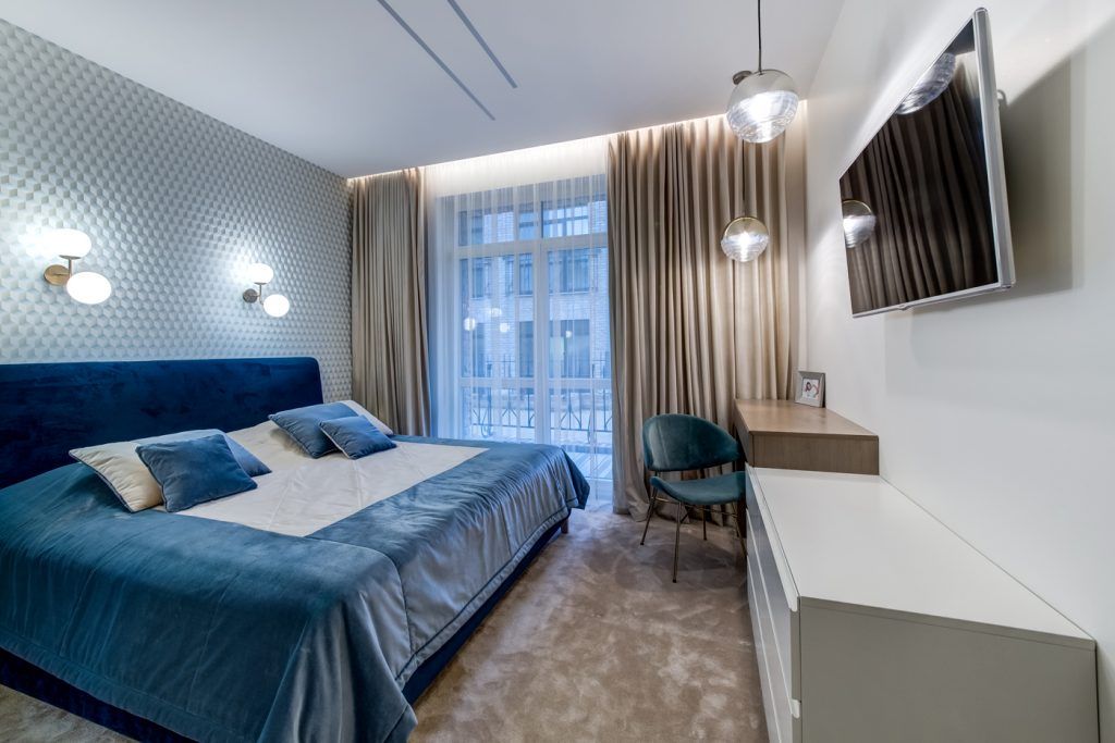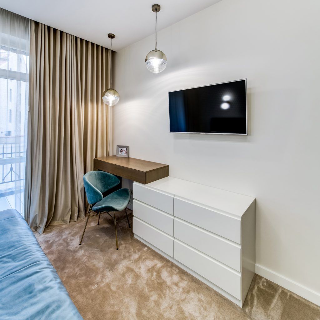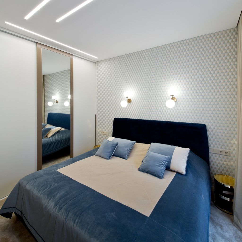 Aceeasi linie de amenajare o intalnim si in dormitoare. Dormitorul matrimonial poate fi definit prin doua cuvinte confortabil si functional. Patul asezat central este piesa principala, impresioneaza prin generozitate si prin texturile alese. Cromatica aleasa se pastreaza si aici, nuante de alb crem in combinatie cu accente de albastru pentru un plus de energie. Adaugam si cele doua lampi suspendate, peretele accent cu tapet si lumina naturala, iar rezultatul este un spatiu cald, intim si personalizat.