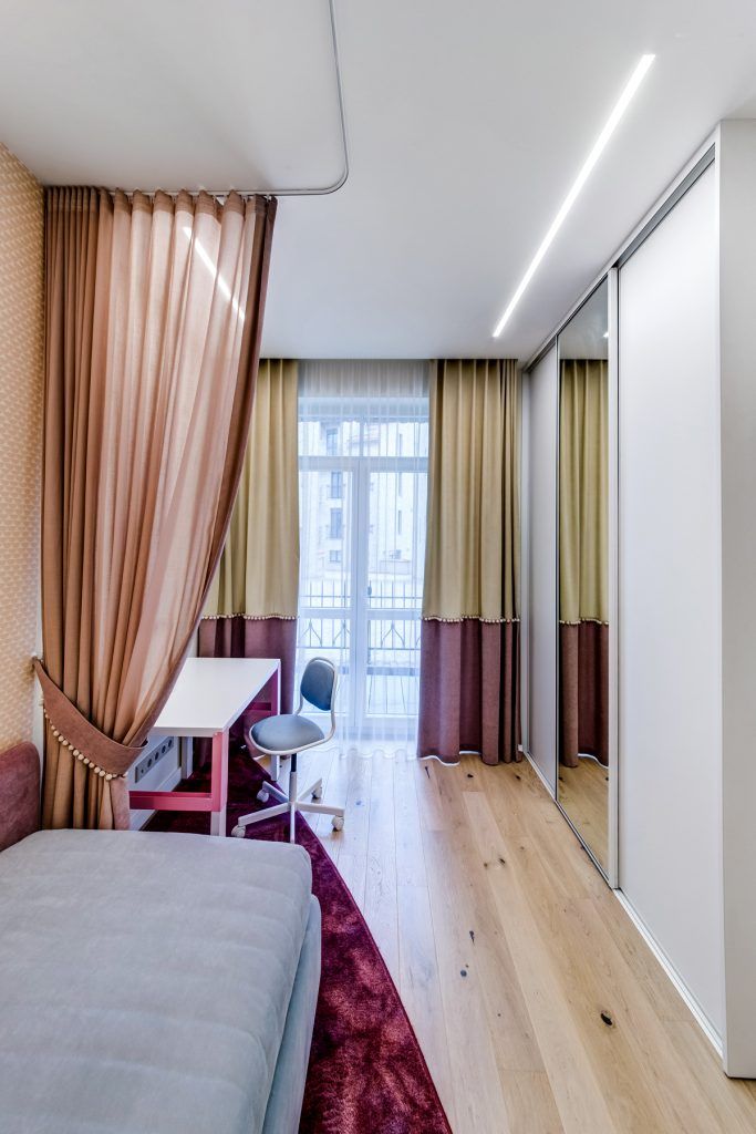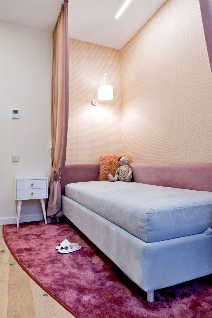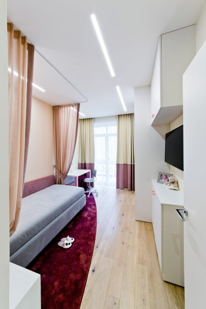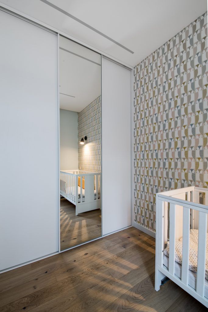 Camerele copiilor sunt vesel colorate, in accente de visiniu, frez petru fetita si accente de culoare blue pentru baietel. Din nou regasim perete accent cu tapet pentru o nota personala precum si dulapuri dedicate depozitarii.