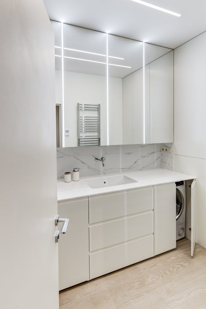 Deschide GaleriaAmenajarea urmeaza o abordare simpla cu mobilier definit de linii si forme drepte, acompaniat de o cromatica neutra, pe un fundal predominant alb. Lumina joaca un rol cheie in aceasta amenajare, acela de a pune mai bine in valoare fiecare detaliu dar si pentru a crea un efect vizual de marire al spatiului.