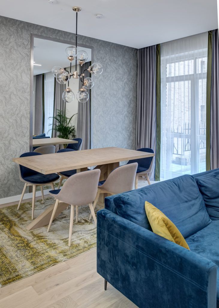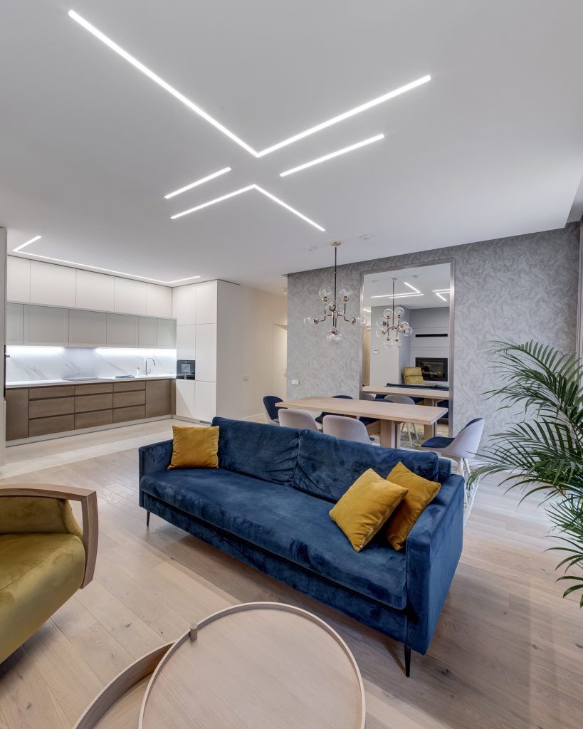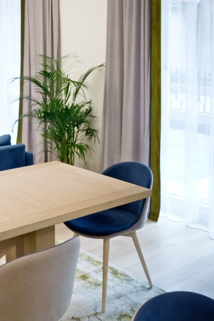 Living-ul multifunctional, in plan deschis cu bucataria si zona de luat masa, formeaza un spatiu unic, prelungit si ideal pentru o familie extinsa. Ne bucuram de o camera aerisita cu o cromatica echilibrata unde accentele de albastru sunt stinse cu nuante calde de crem, bej si alb. Draperiile impreuna cu planta decorativa ne transpun o noua tema abordata, si anume natura.