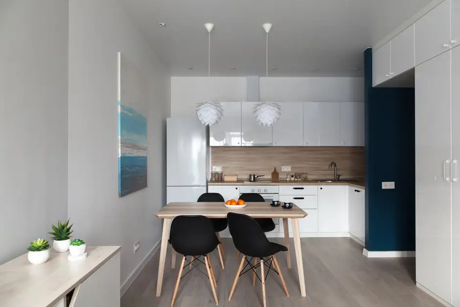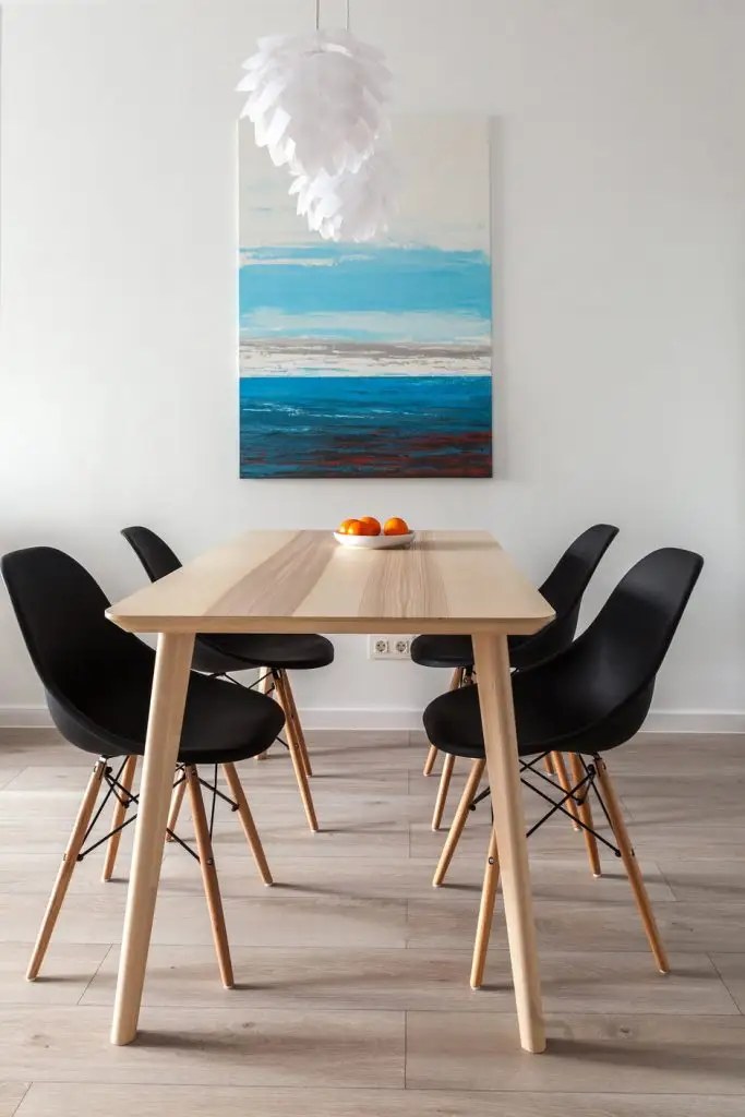 Locul de luat masa este simplu, cu lemn si scaune negre tip Eames; cele doua corpuri de iluminat suspendate si tabloul din dreptul mesei contureaza un ambient placut.