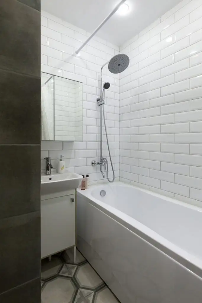 In baie, spatiul a fost amenajat cat mai functional posibil, zona de spalare cu lavoarul si cada fiind separate de zona de toaleta printr-un perete-partitie.