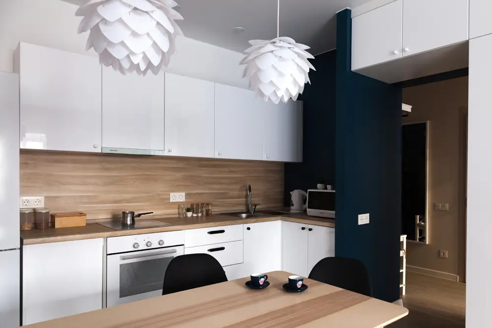 Bucataria a fost gandita ca o zona compacta, unitara, cu mobilier dispus in forma literei L. Electrocasnicele sunt incastrate, cu exceptia frigiderului. Designul mobilierului este unul simplu, cu fronturi albe, lucioase pentru a amplifica spatiul si a spori luminozitatea incaperii.