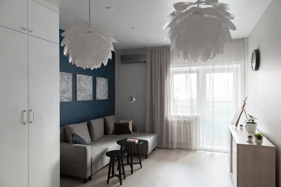 Livingul este sumar conturat, cu o canapea tip coltar, masute minimaliste si un corp tip comoda. Paleta de culori este predominant neutra, deschisa, cu accente de albastru menite sa aduca un plus de profunzime decorului. Albastrul il intalnim in living, dar si in hol pentru a crea ideea de continuitate si unitate a spatiilor.