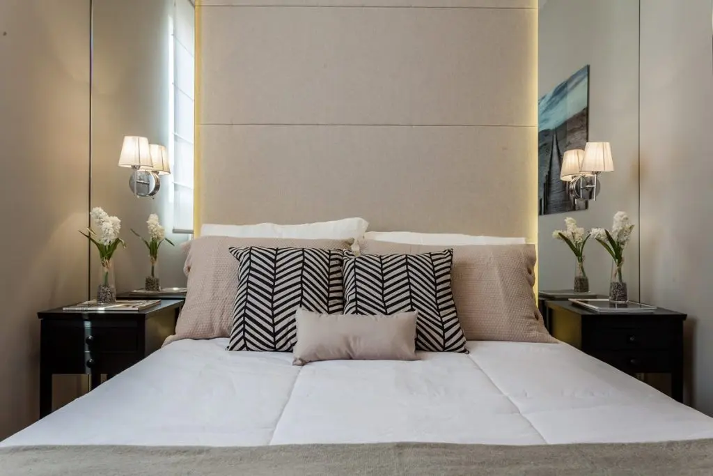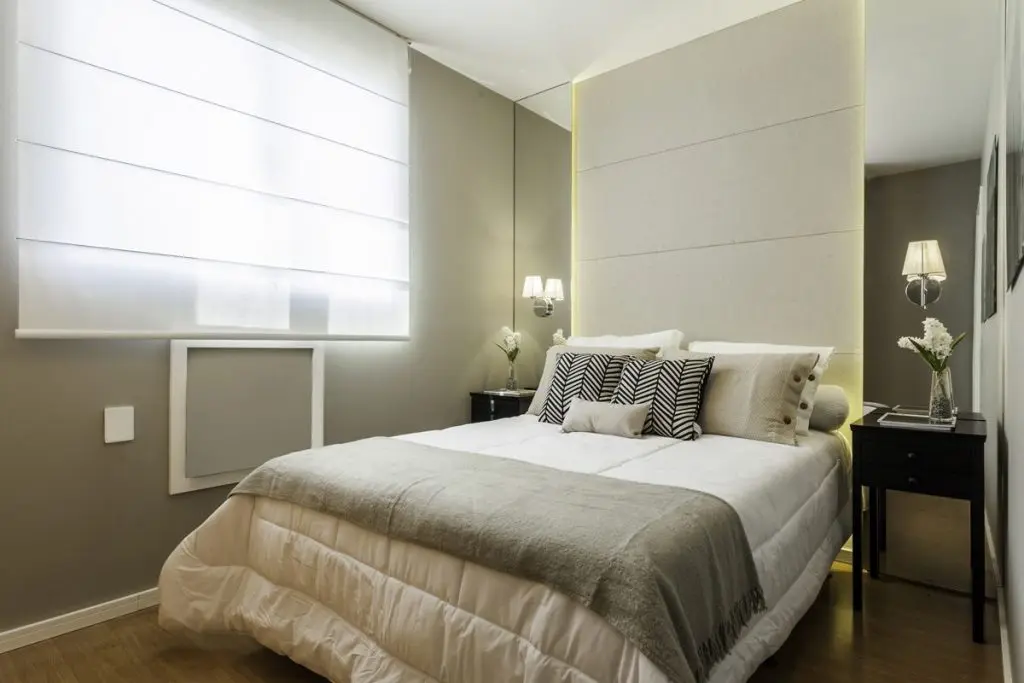 Dormitoarele sunt restranse, dar optimizate pentru a putea asigura confortul necesar. Pentru cel matrimonial, designerul a mizat pe acelasi truc cu oglinzi, aici fiind pozitionate simetric, de o parte si cealalta a patului. Patul ocupa spatiul central al incaperii, acompaniat de doua noptiere cu un design potrivit acestui spatiu.