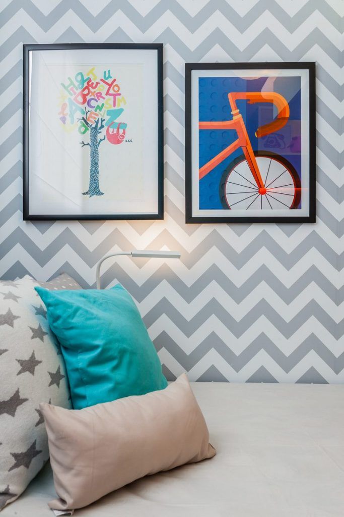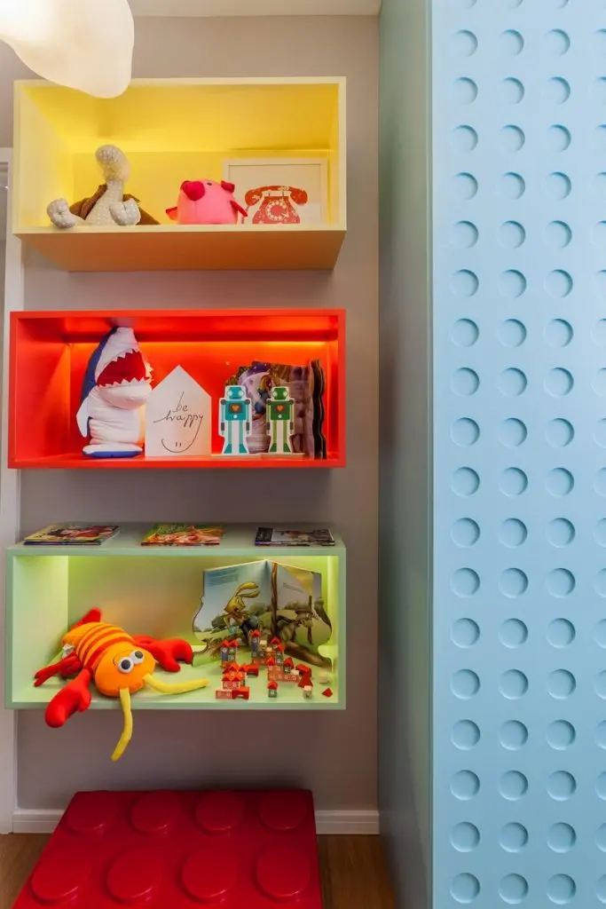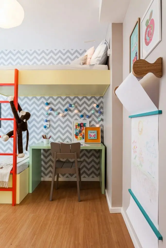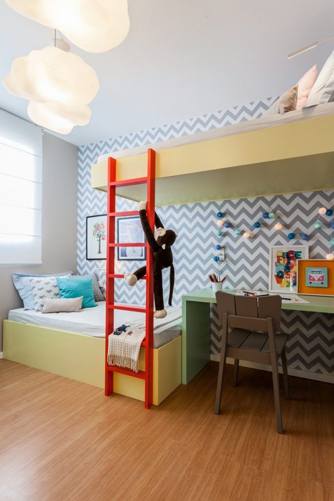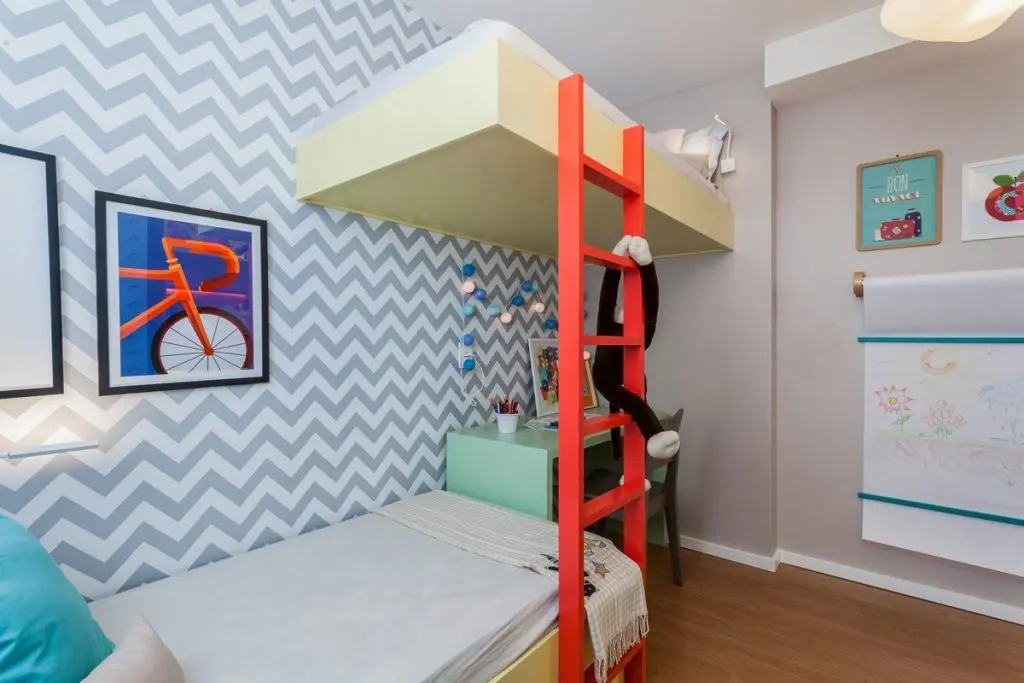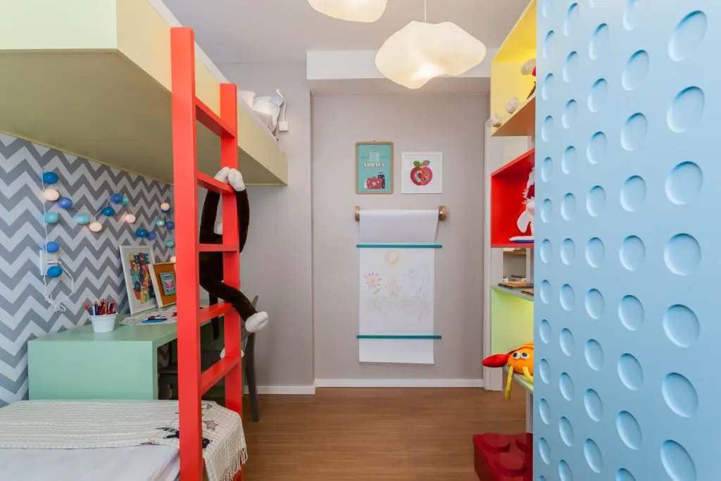Camera copiilor a fost gandita cu un pat inaltat, iar celalalt pe podea, legatura intre ele fiind realizata printr-o scara colorata. Sub pat a fost integrat un birou, iar peretele decorat cu un imprimeu geometric. Camera este vesela si colorata, cu un dulap creativ gandit ca o piesa de jucarie si 3 rafturi tip cuburi amenajate pentru jucarii.