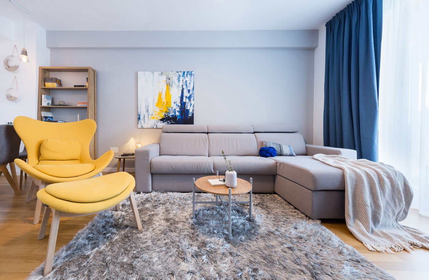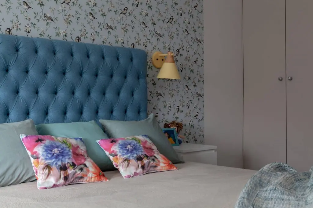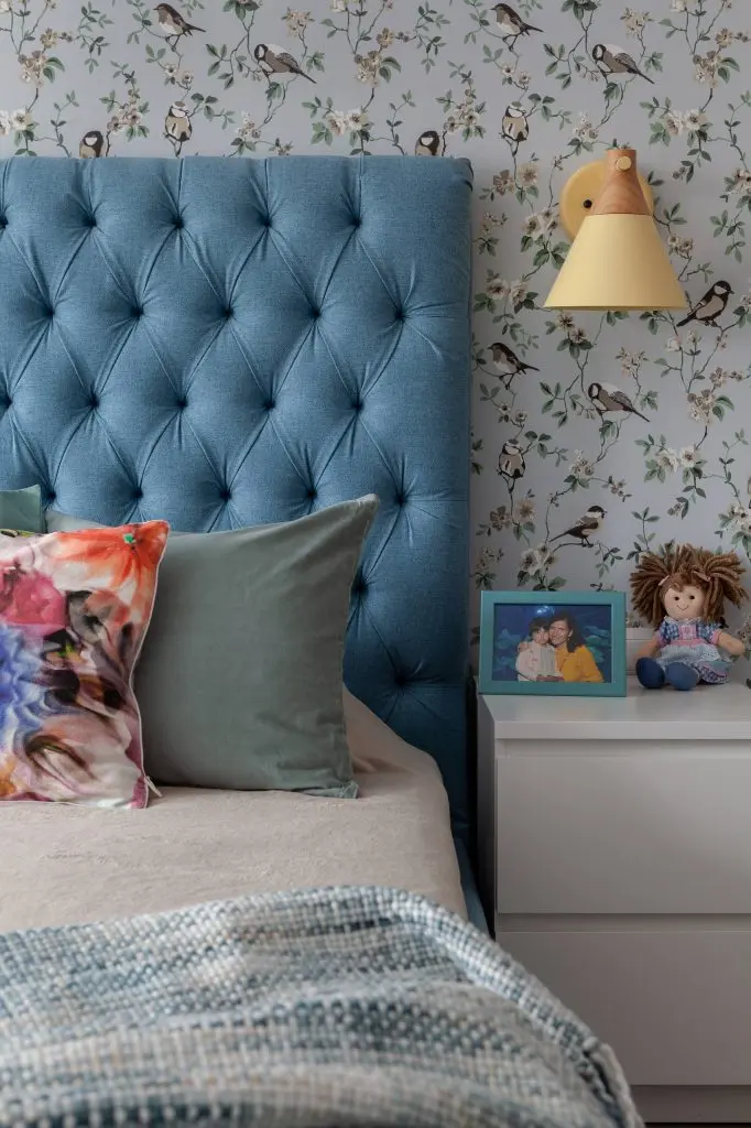Dormitorul matrimonial este cel mai spatios, avand in vedere ca inainte indeplinea functia de living. Fiecare cm este exploatat la maxim si gandit cat mai functional. Paleta coloristica este bazata pe un fundal alb si nuante deschise precum: crem, bej, gri si accente de culori, precum bleu. Patul dublu, cel mai mare posibil dupa cum si-au dorit proprietarii, reuseste sa atraga atentia prin texturile atent alese iar tapetul prin tema naturii, aduce un plus de prospetime intregului decor.