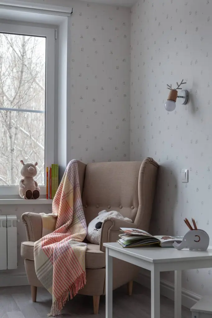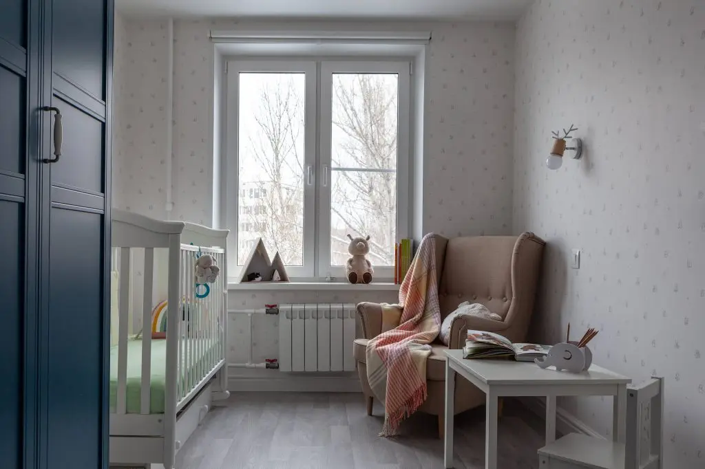 Cel de-al doilea dormitor, ce are o suprafata de doar 8,6 mp pastreaza linia amenajarii din restul apartamentului. Culorile naturale de alb, maro si bej reusesc sa amplifice vizual spatiul iar lumina naturala ajuta si ea la obtinerea unui echilibru vizual. Mobilierul se rezuma la esential: patutul celor doi gemeni, o masuta, un dressing si un fotoliu confortabil.