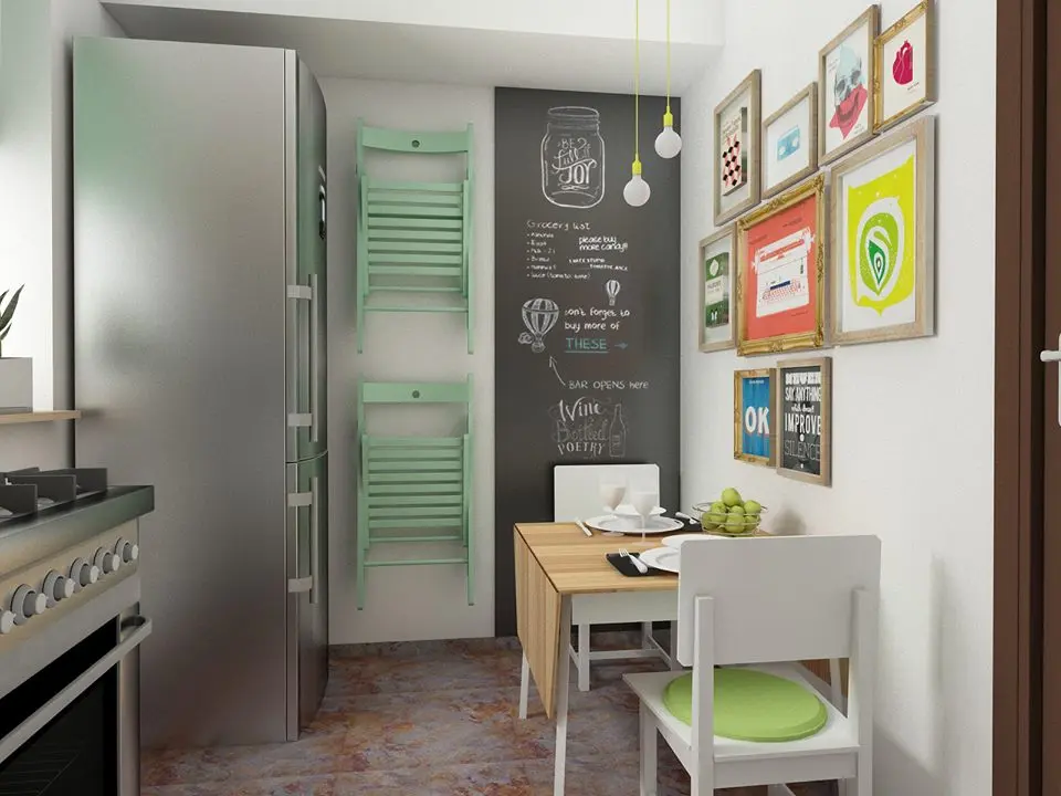 Tematica jucausa se armonizeaza cu functionalitatea incaperii. Masuta de bucatarie este rabatabila si poate fi mutata in living pentru a fi utilizata ca masa de dining pentru momentele festive. Scaunele pliante pot fi agatate de peretele din bucatarie atunci cand nu sunt folosite, devenind astfel o decoratiune colorata. In plus, banda cu vopsea de tabla scolara pe care se poate scrie cu creta si colajul de printuri inramate completeaza compozitia colorata din zona de luat masa. Ideea becurilor suspendate este reluata si in bucatarie, fiind pozitionate deasupra mesei si blatului de lucru.