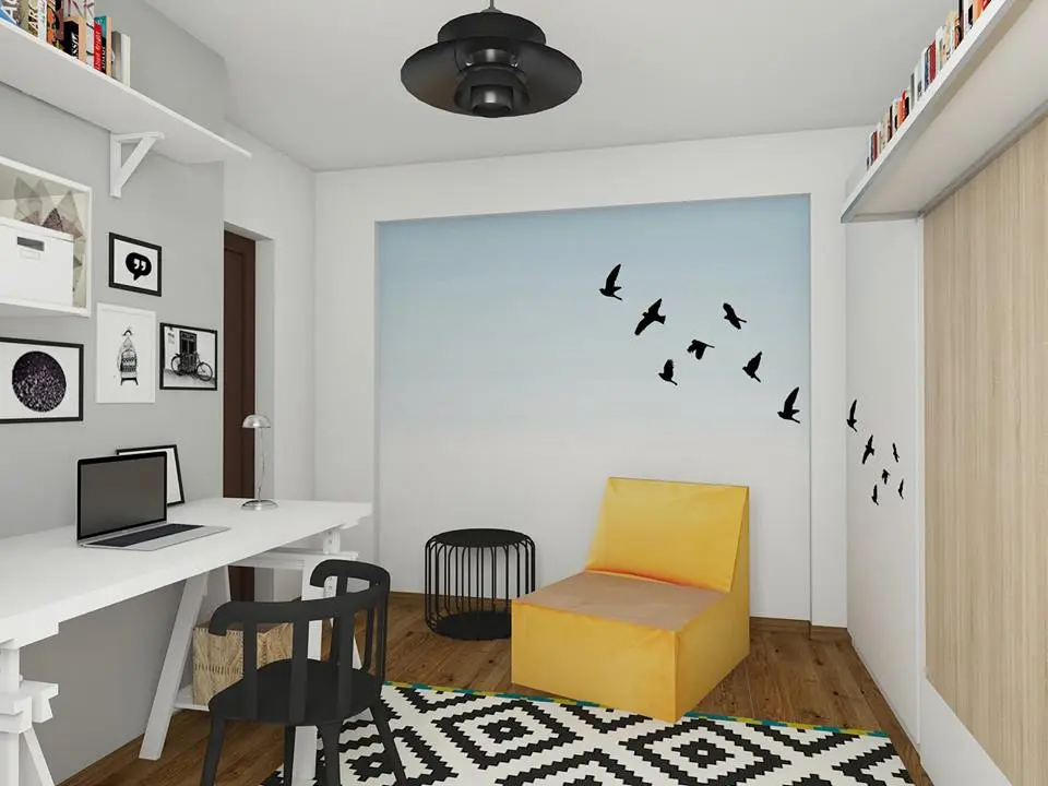 De asemenea, in dormitor s-a optat pentru un pat rabatabil creat de cei de la Monello, care, atunci cand nu este utilizat, poate fi ridicat la perete oferind mai mult loc liber in centrul camerei. Avand putini metri patrati, dormitorul contine mai multe subfunctiuni armonios integrate in ansamblul amenajarii: o zona de lectura si o zona de birou. Coltul de lectura este pus in valoare de un perete accent vopsit intr-o culoare linistitoare, in stil ombre, pe care au fost adaugate ulterior stickere cu pasari stilizate. Fotoliul galben completeaza aceasta atmosfera ce te indeamna la visare si relaxare.