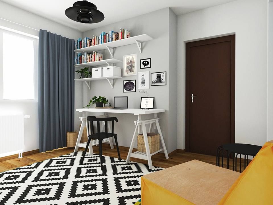 Avand putini metri patrati, dormitorul contine mai multe subfunctiuni armonios integrate in ansamblul amenajarii: o zona de lectura si o zona de birou. Coltul de lectura este pus in valoare de un perete accent vopsit intr-o culoare linistitoare, in stil ombre, pe care au fost adaugate ulterior stickere cu pasari stilizate. Fotoliul galben completeaza aceasta atmosfera ce te indeamna la visare si relaxare.