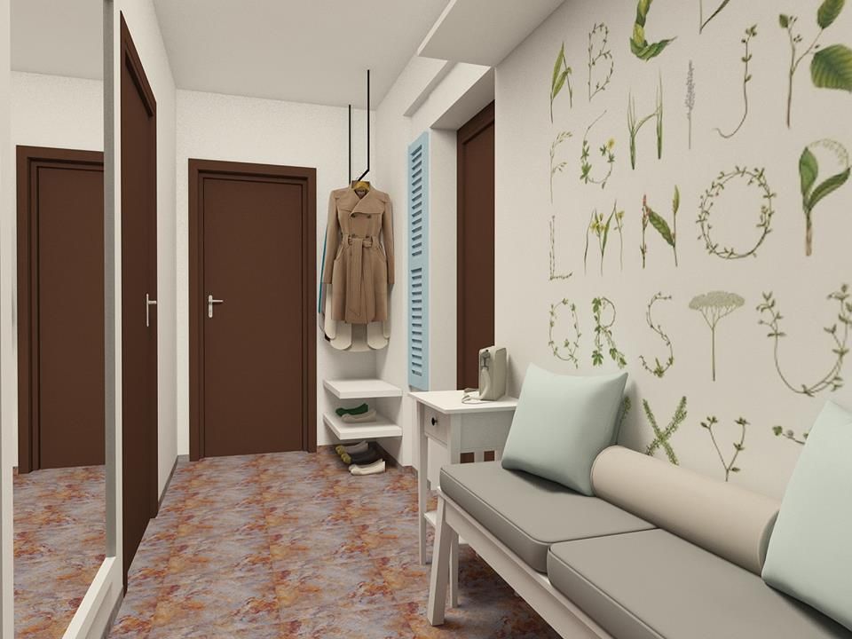Nici holului nu-i lipseste personalitatea. Tapetul cu motiv botanic de la X T D EC O, cuierul cu haine la vedere (format din niste bare metalice prinse in plafon si din 2 polite pentru incaltaminte) si mai ales oblonul de lemn vopsit (tot pentru suportul accesoriilor) contureaza un spatiu vesel si placut care te intampina inca de la primii pasi in locuinta.
