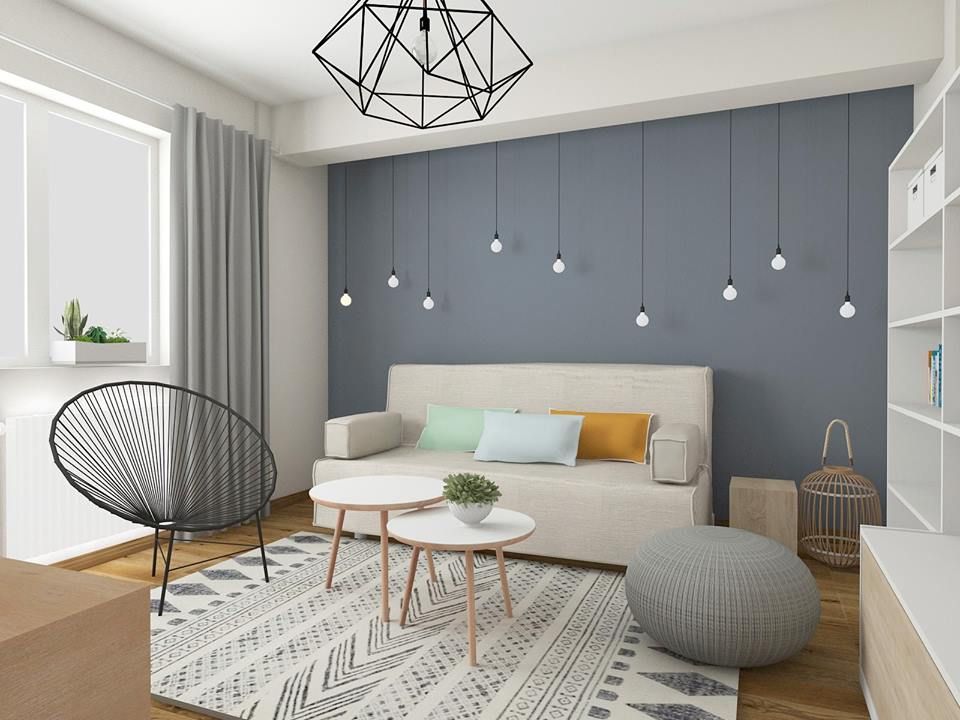 In living vom gasi o canapea extensibila si spatii de depozitare multiple intrucat mama clientei va locui ocazional in acelasi apartament. Peretele gri-albastrui din spatele canapelei precum si corpurile de iluminat reprezentate de o instalatie de becuri suspendate sunt elemente care transforma camera intr-un interior original.