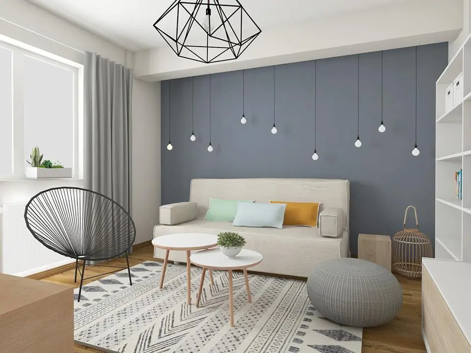 Peretele gri-albastrui din spatele canapelei precum si corpurile de iluminat reprezentate de o instalatie de becuri suspendate sunt elemente care transforma camera intr-un interior original.
