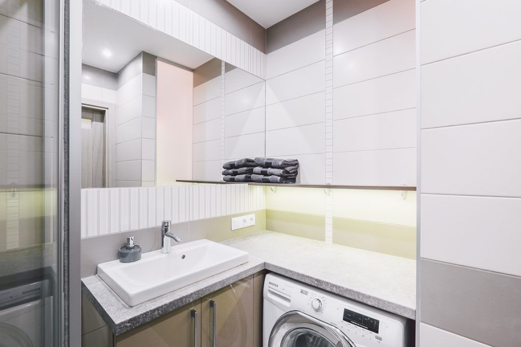 Cuvantul de baza pentru baie este functionalitatea, cu zone de depozitare, inclusiv pentru masina de spalat rufe.