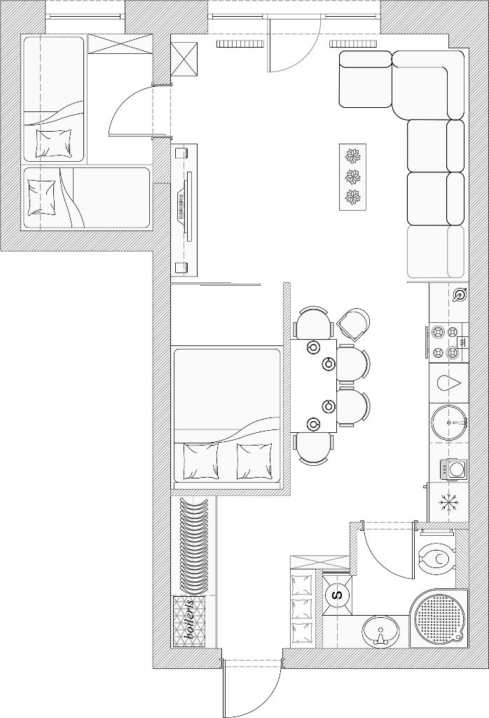 Pentru acest apartament de 48 metri patrati, beneficiarii au dorit o amenajare luminoasa si confortabila. Spatiul nu va fi locuit permanent, de aceea accentul a fost pus pe zonele comune si mai putin pe depozitare.