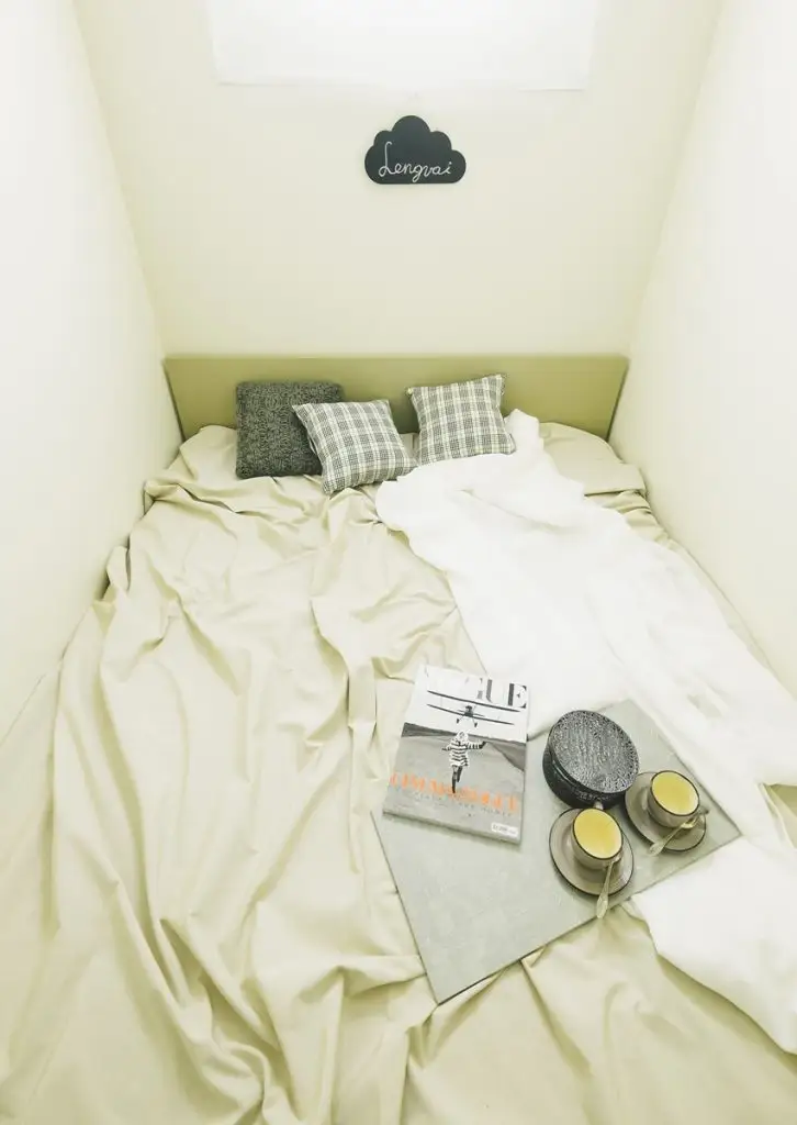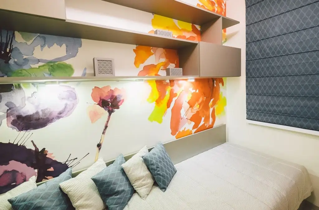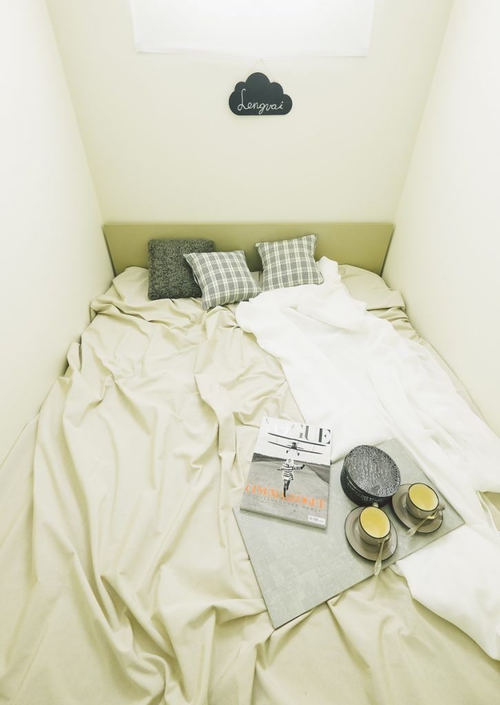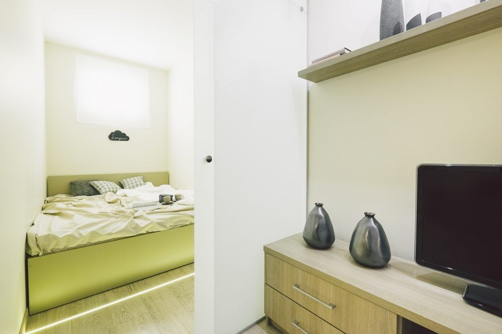 In acest spatiu exista doua dormitoare, unul mic destinat parintilor si unul pentru copii amenajat cu doua paturi. Dormitorul matrimonial este practic o incapere ingusta, in care patul este piesa principala si singura de altfel. Pentru camera copiilor s-a reluat tematica imprimeului floral din zona bucatariei, cu spatii mici de depozitare si paturi dispuse perpendicular.