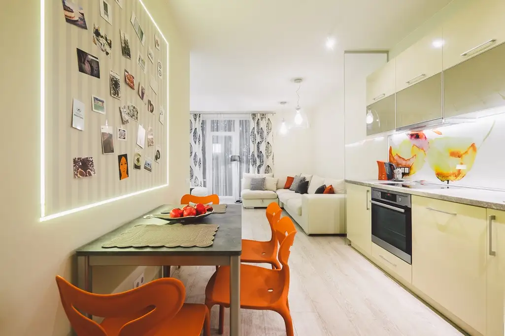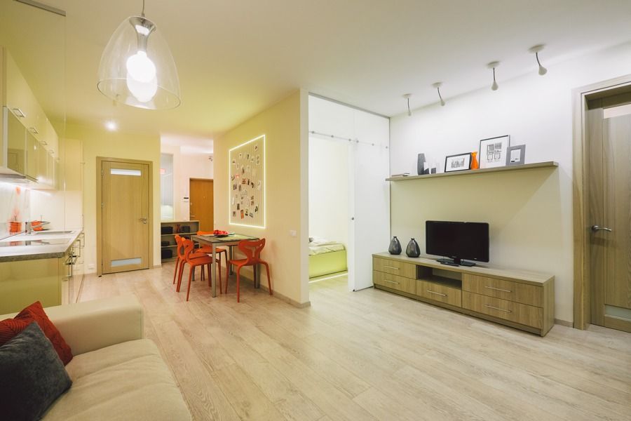 Intreaga amenajare a fost gandita cat mai minimal pentru a reusi integrarea armonioasa a functiunilor principale: livingul si bucataria. De altfel, cele doua zone formeaza un tot unitar armonios. Cromatica abordata pune accentul pe neutre, culori deschise care amplifica spatiul si ii sporesc luminozitatea. Accentele de culoare aduc un plus de veselie camerei.
