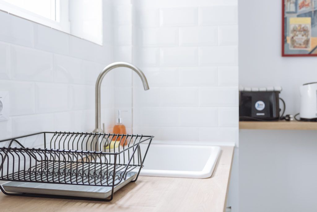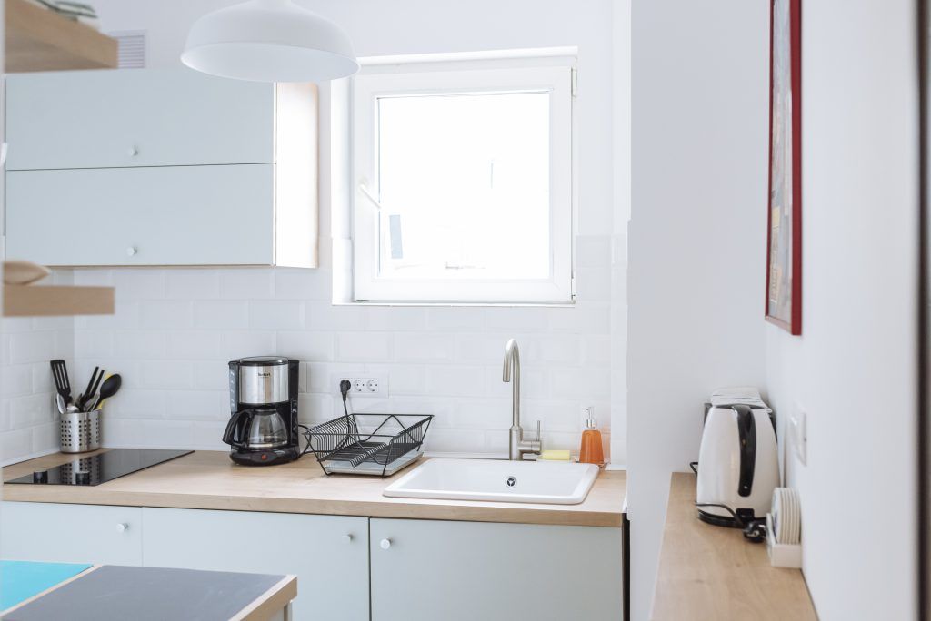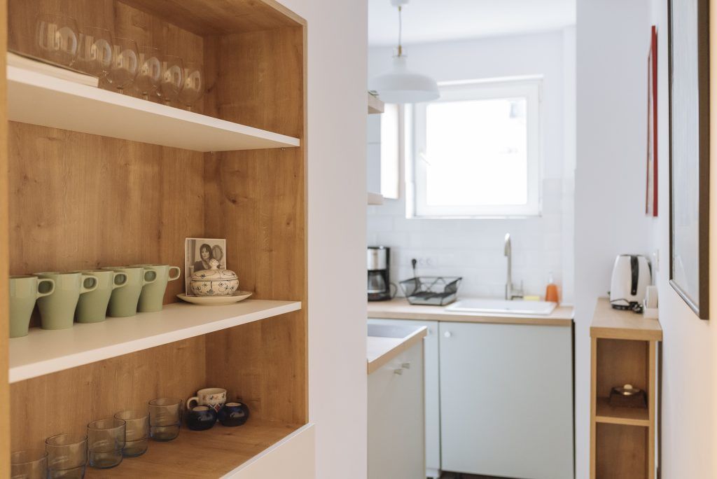 Bucataria este redusa ca dimensiuni, dar a fost amenajata cu toate cele necesare unui apartament de inchiriat, inclusiv electrocasnicele. Nuanta de accent folosita – un verde-menta discret.