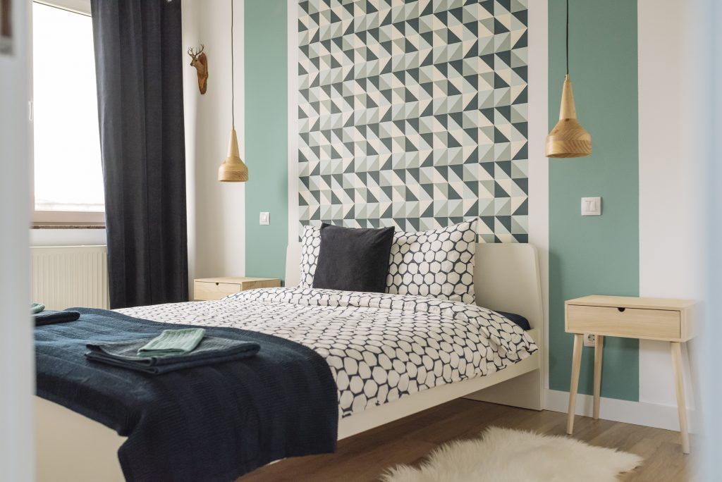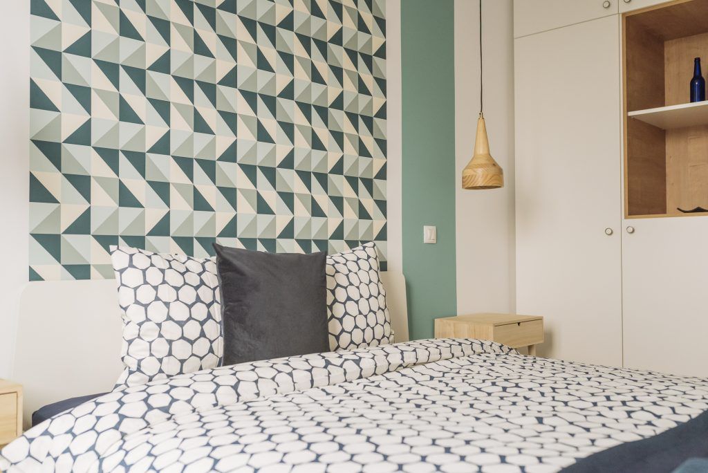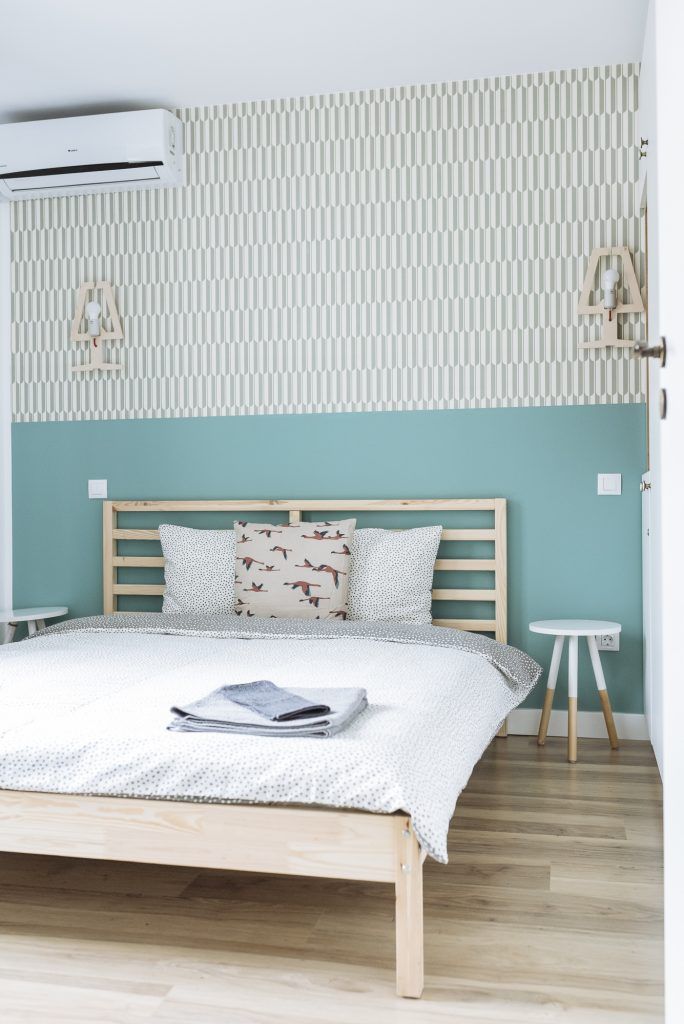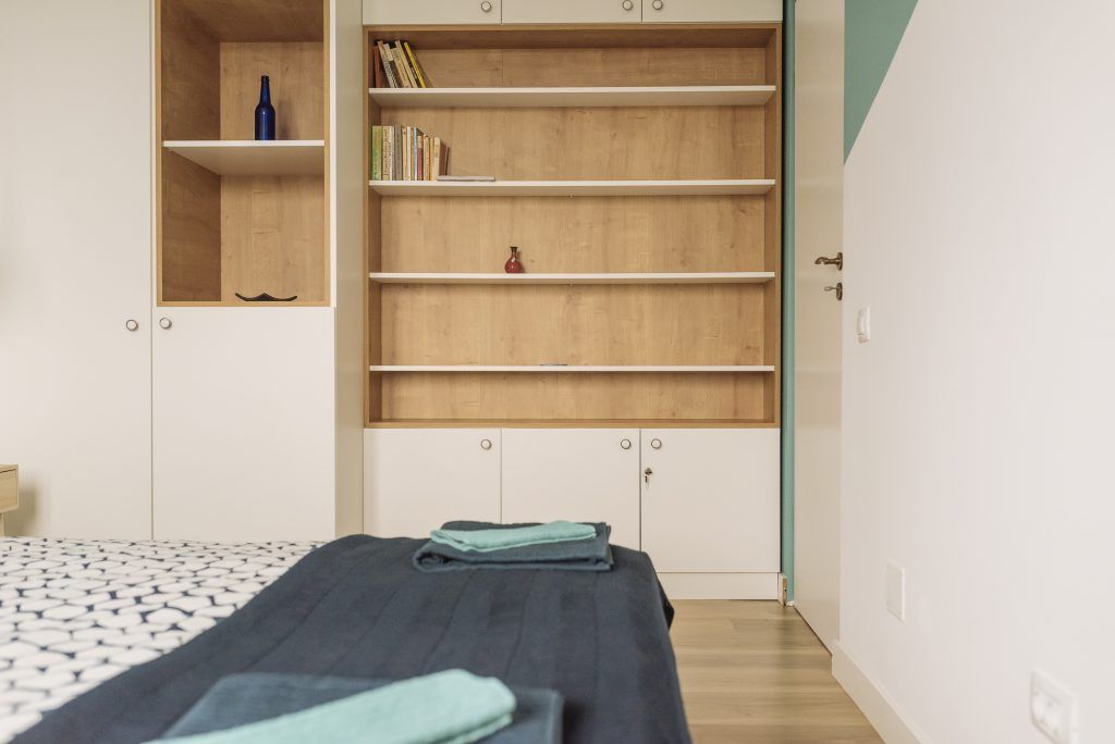 Tematica este preluata si in cele doua dormitoare. Amenajarea urmeaza o linie simpla asa cum o regasim si in living. Ca elemente de accent, Irina a optat pentru un tapet cu imprimeu grafic si vopsea in aceleasi nuante de albastru. Totul este echilibrat cu ajutorul albului si lemnului. Si zonele de depozitare sunt bine valorificate pentru a oferi spatiile necesare fiecarui turist indiferent de cat timp va petrece in acest apartament.