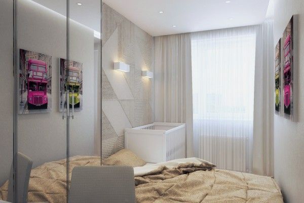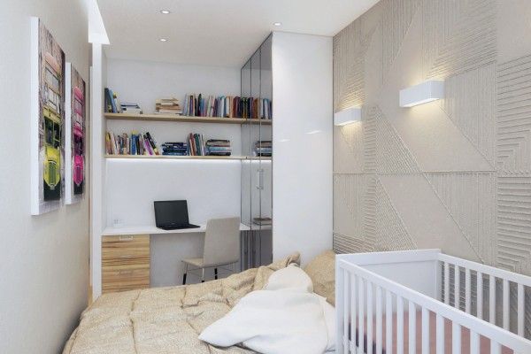 In dormitorul mic, vom gasi atat patul parintilor cat si patutul bebelusului si chiar un birou minuscul lipit de dulap. O amenajare usor ingramadita intrucat nu exista loc de trecere, patul ocupand o mare parte din spatiul pe latime. Nuantele neutre pastreaza totusi decorul aerisit.