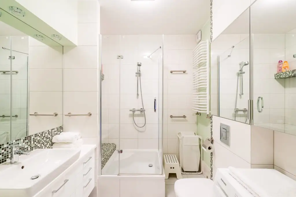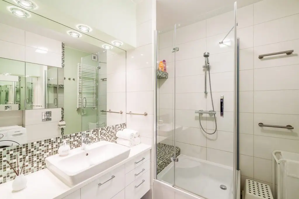 Inspiratie vei gasi si in amenajarea baii. Mult alb, insertii de mozaic si suprafete mari cu oglinzi (vezi pe partea lavoarului, dar si partea opusa la nivelul dulapurilor), precum si o cabina de dus, toate compun o baie moderna, functional amenajata.