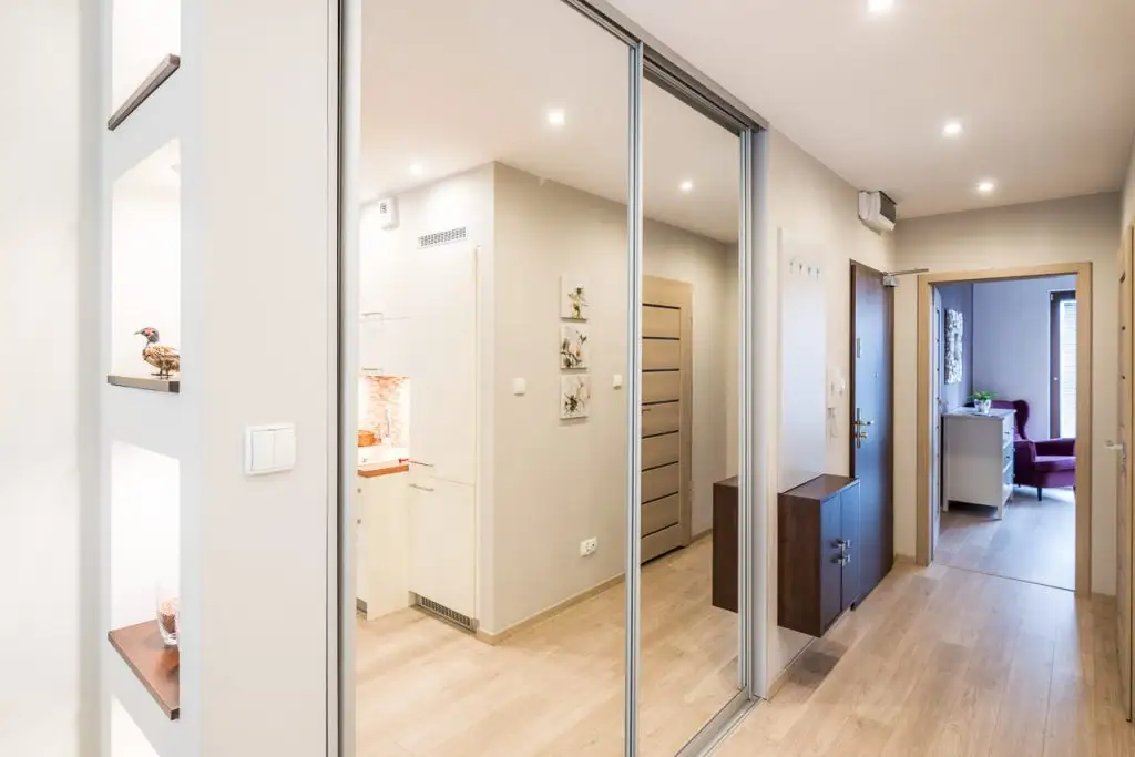 In spatiul holului gasim o zona in care a fost integrat un dressing cu usi glisante si acoperite cu oglinzi. Efectul de marire a suprafetei face ca aceasta idee cu oglinzi sa fie o solutie excelenta pentru o zonamica, ingusta sau mai putin luminoasa.