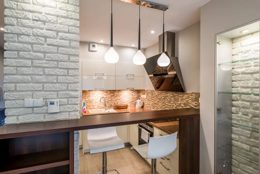 Iluminatul este discret, cu spoturi incastrate in plafon la care se adauga un corp de iluminat general si trei lampi suspendate deasupra blatului tip bar.