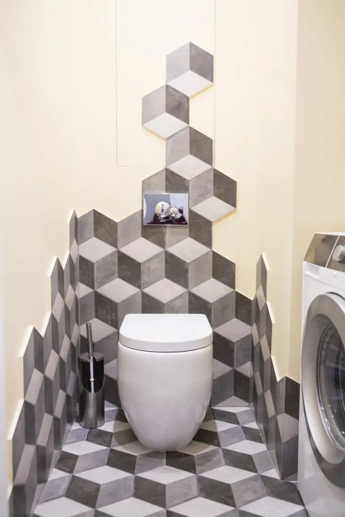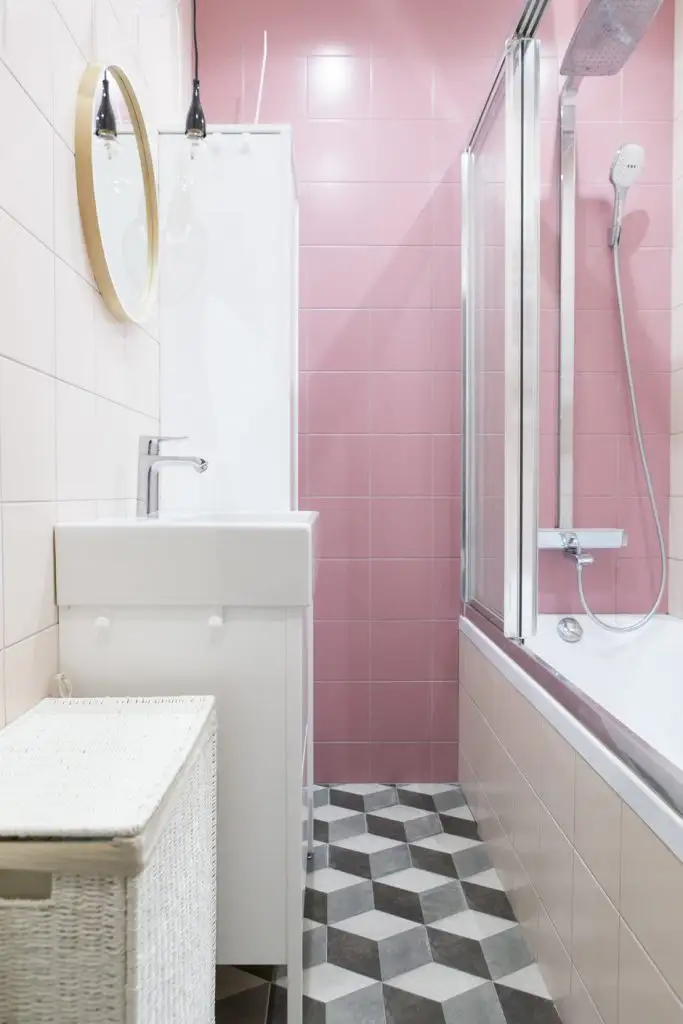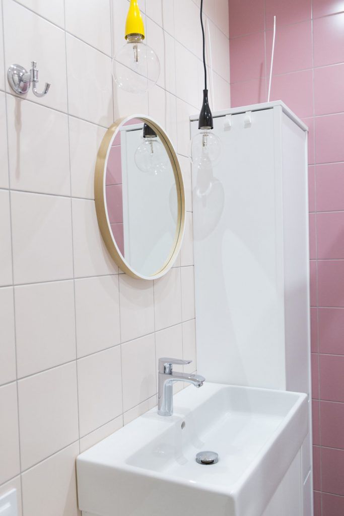 Nici in baie nu puteau lipsi accentele de culoare, asa ca si aici designerii s-au jucat cu placi de faianta roz prafuit si gresie cu un model tridimensional.