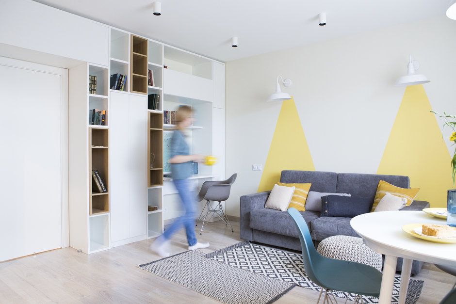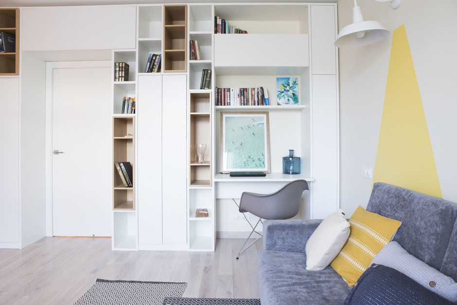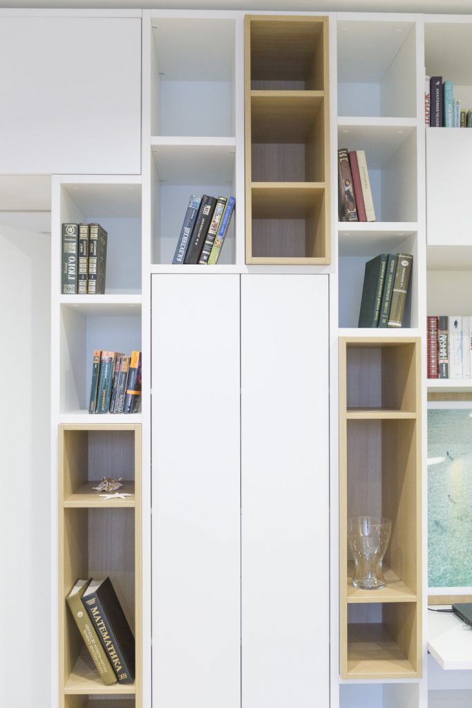 Deschide GaleriaPentru a spori spatiile de depozitare, au fost operate cateva modificari functionale. In hol, usa spre bucatarie a fost eliminata pentru a crea o nisa cu dulap. Mai apoi, in living, peretele dinspre bucatarie a fost prevazut cu 2 usi simetric pozitionate, creand astfel un acces facil spre bucatarie.