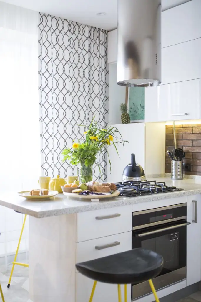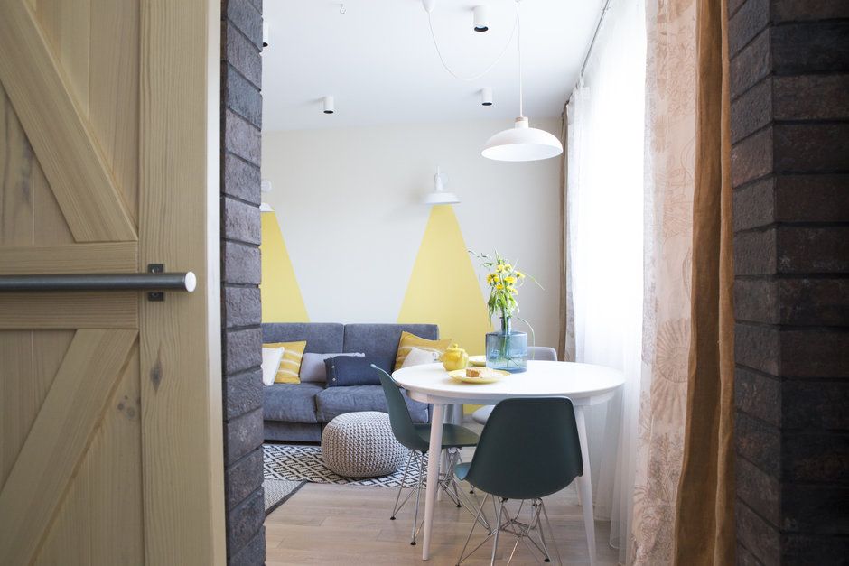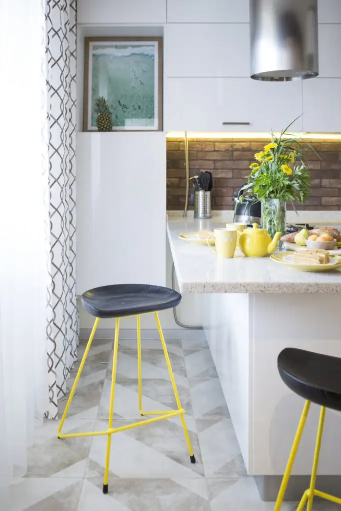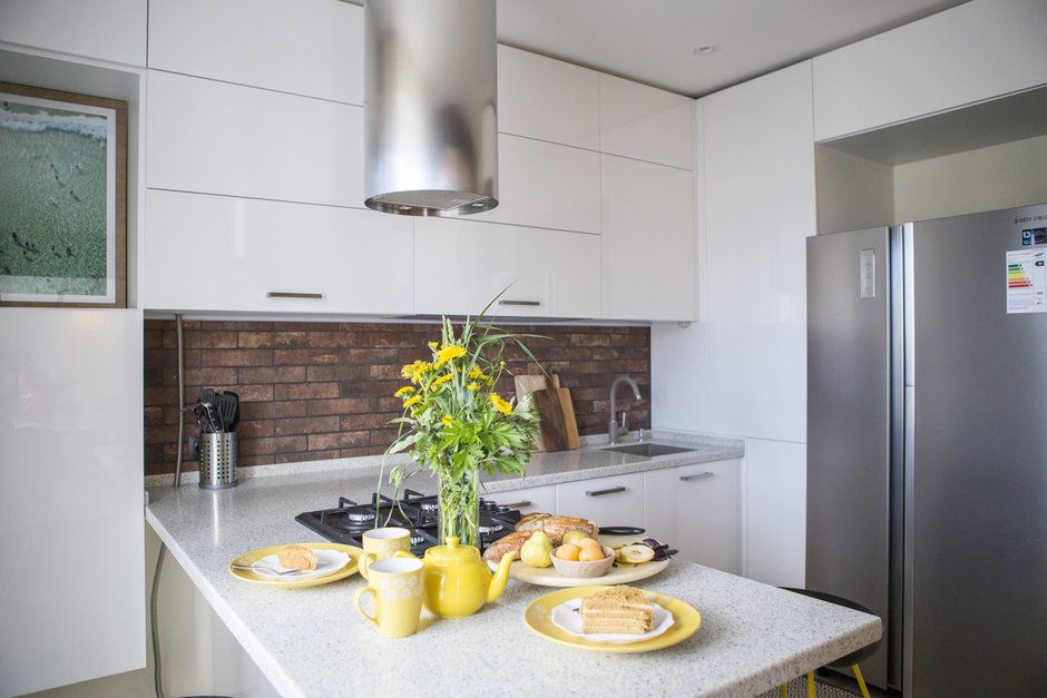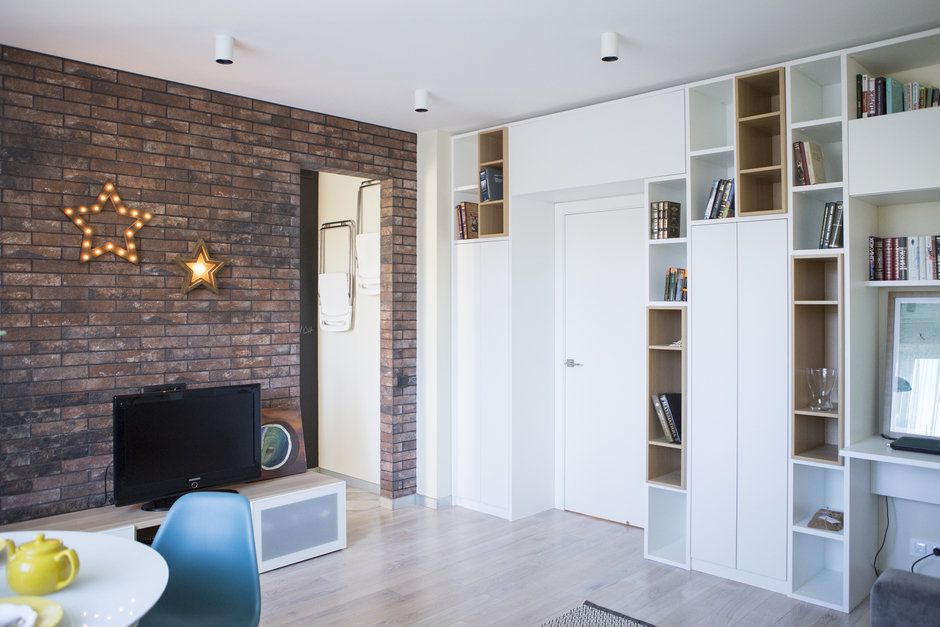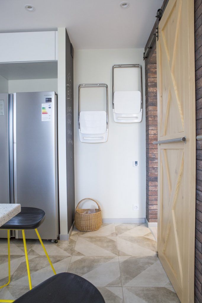 In locul fostei usi a fost amenajata o nisa ce incastreaza frigiderul, iar peretele comun cu livingul preia finisajul cu caramida aparenta, lasand impresia ca spatiul este unul si acelasi, reducand din bariera impusa de delimitarea existenta.