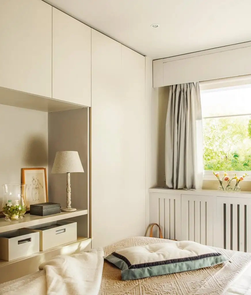 In plus, au fost adaugate masti de calorifer pentru un plus de estetica si spatii de depozitare in dreptul ferestrelor. Astfel, pe langa portiunea inchisa care mascheaza caloriferul, au fost create cateva rafturi deschise folosite acum ca mini-biblioteca.