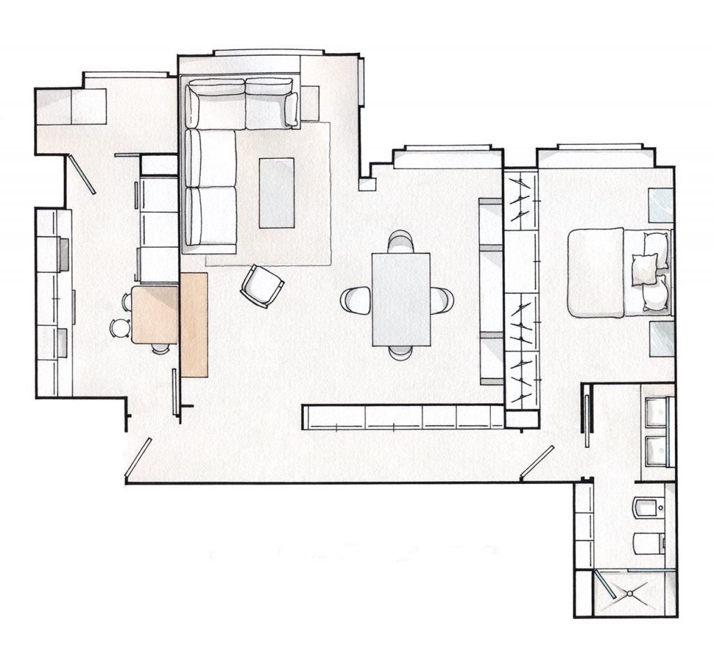 Au fost eliminati pereti si camerele au fost conectate. Livingul si diningul fac parte acum dintr-o singura incapere cu acces catre terasa, iar in dormitor s-a creat o zona spatioasa pentru depozitarea hainelor si o baie incapatoare.