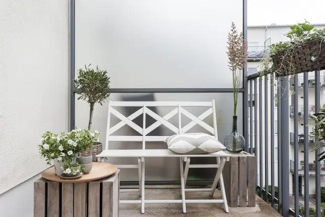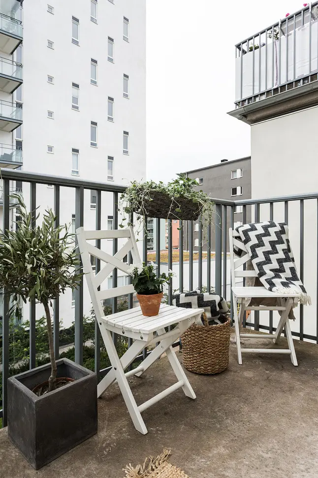 Doua scaune din ratan, o bancuta ingenioasa care pare realizata din 3 scaune si ghivece cu plante care sa aduca un strop din prospetimea gradinii aflate in curtea interioara a imobilului unde se afla apartamentul, asa am descrie locul unde mi-as incepe diminetile de weekend alaturi de o cafea aburinda.