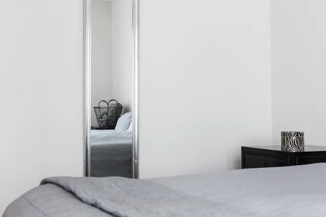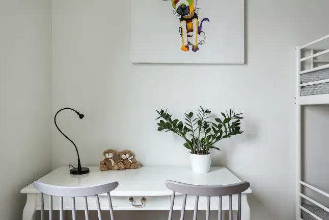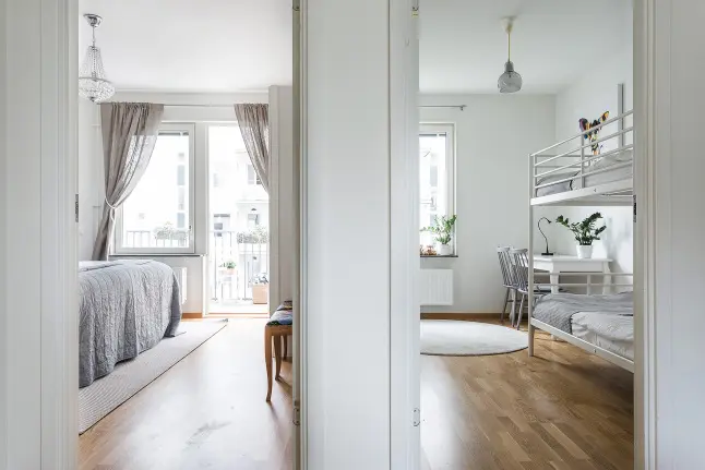 Zona de noapte cuprinde cele doua dormitoare: matrimonial si camera copiilor. Un decor minimal, confortabil, in paleta de griuri si alb ne confirma inca o data ca “less is more”. Folosind paturi supraetajate si o masa cu doua scaune pe post de birou, designerul a decorat eficient spatiul in comun al copiilor acestei familii.