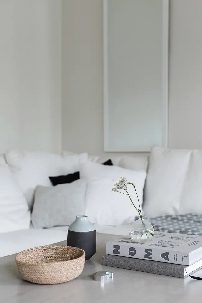 Accentele de gri si negru contrasteaza elegant cu albul peretilor si al pieselor de mobilier, iar nuantele naturale din lemn confera caldura spatiului.